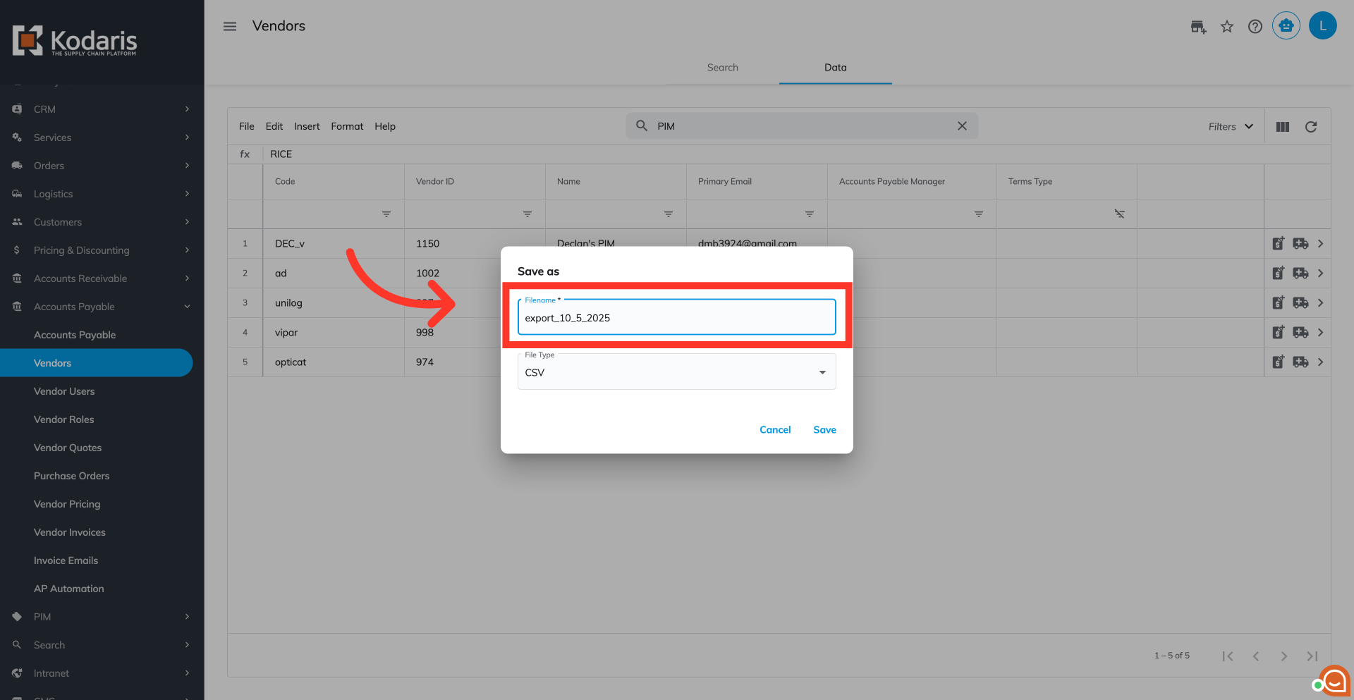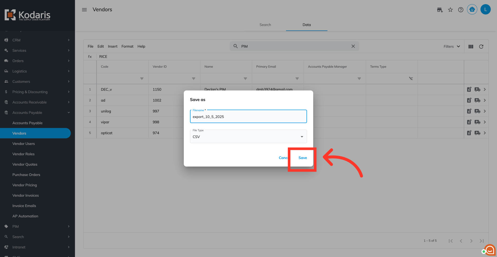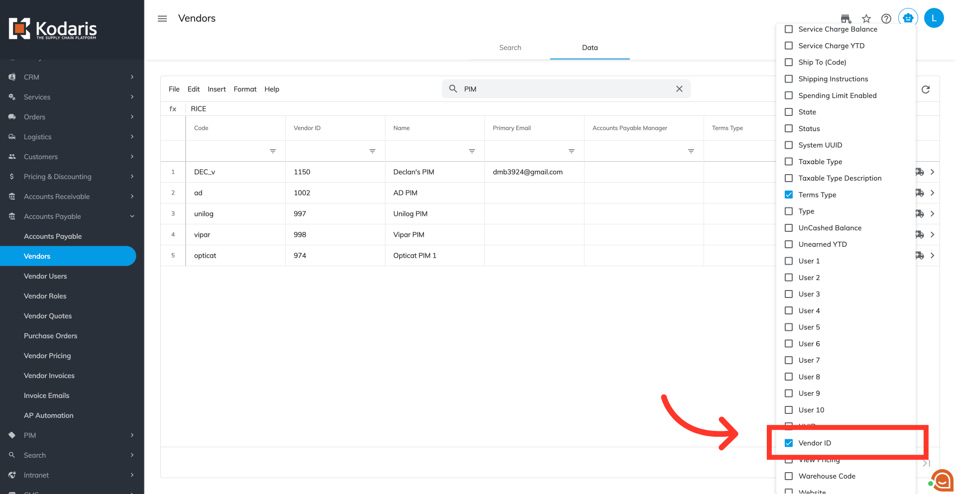 Choose the columns you would like to include in the export. For this example, we are choosing "Code," "Vendor ID," "Name," "Primary Email," "Accounts Payable Manager," and "Terms Type" columns.
