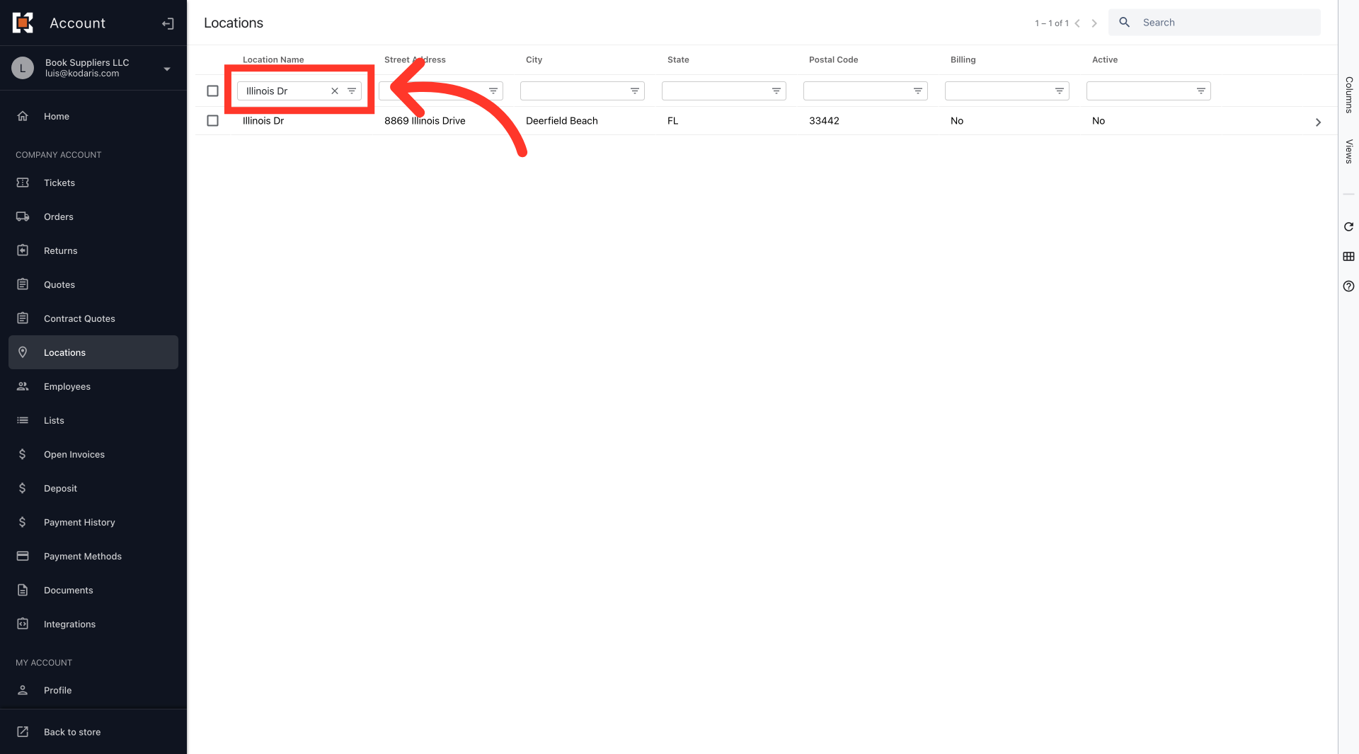 Search for the location. Type in the name of the location address that you want to display or hide in the "Location Name" column filter or "Search" field.
