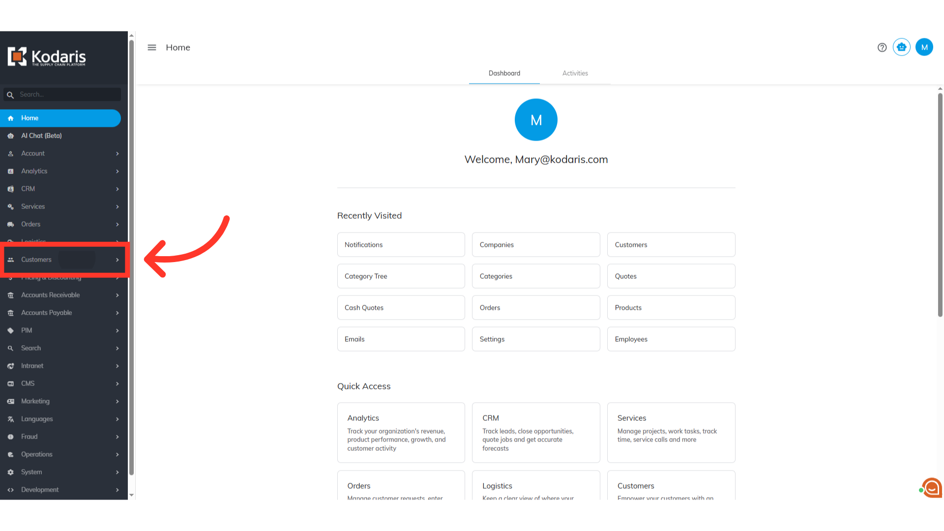 Then, click "Companies". In order to access "Companies" you will need to be set up either as an "administrator" or a "superuser", or have the appropriate roles: "companyView and companyEdit", or "crmCompanyView and crmCompanyEdit". Just a reminder, "crmCompanyView and crmCompanyEdit" access only allows employees to view companies that are assigned to them.