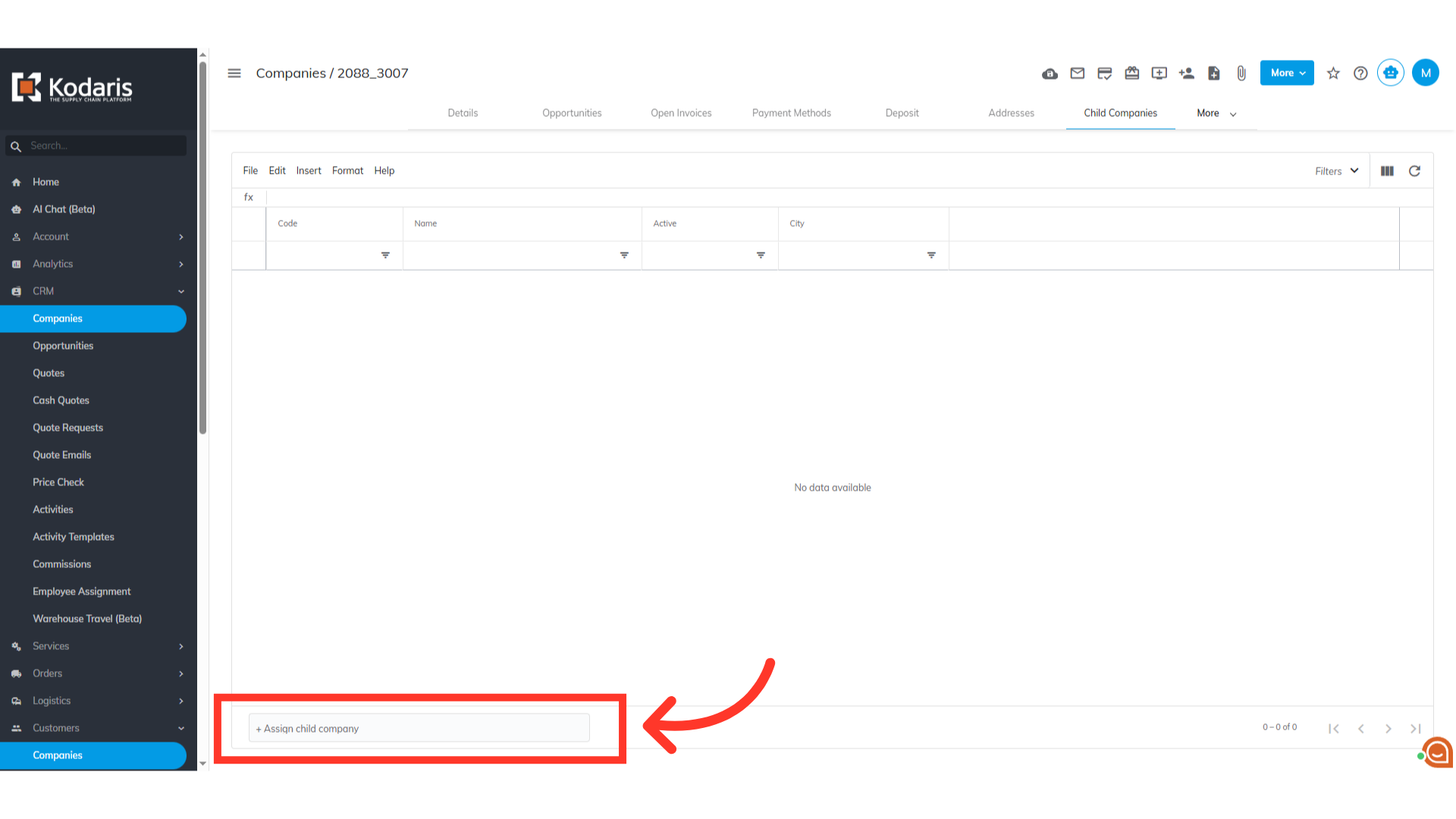 At the bottom of the screen, click on the "+Assign child company" field to add child companies.