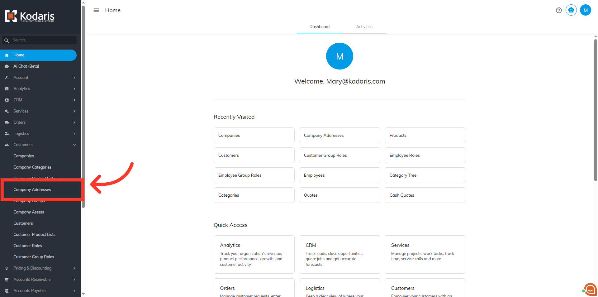 Then, click on the "Company Addresses". In order to access “Customer Addresses” you will need to be set up either as an "administrator" or a "superuser", or have the appropriate roles: “companyAddressView” and “companyAddressEdit”.