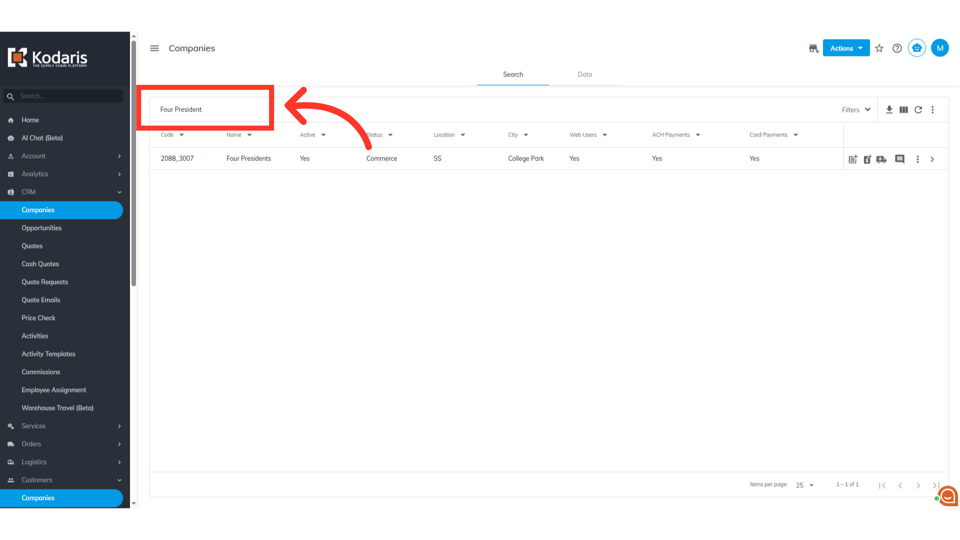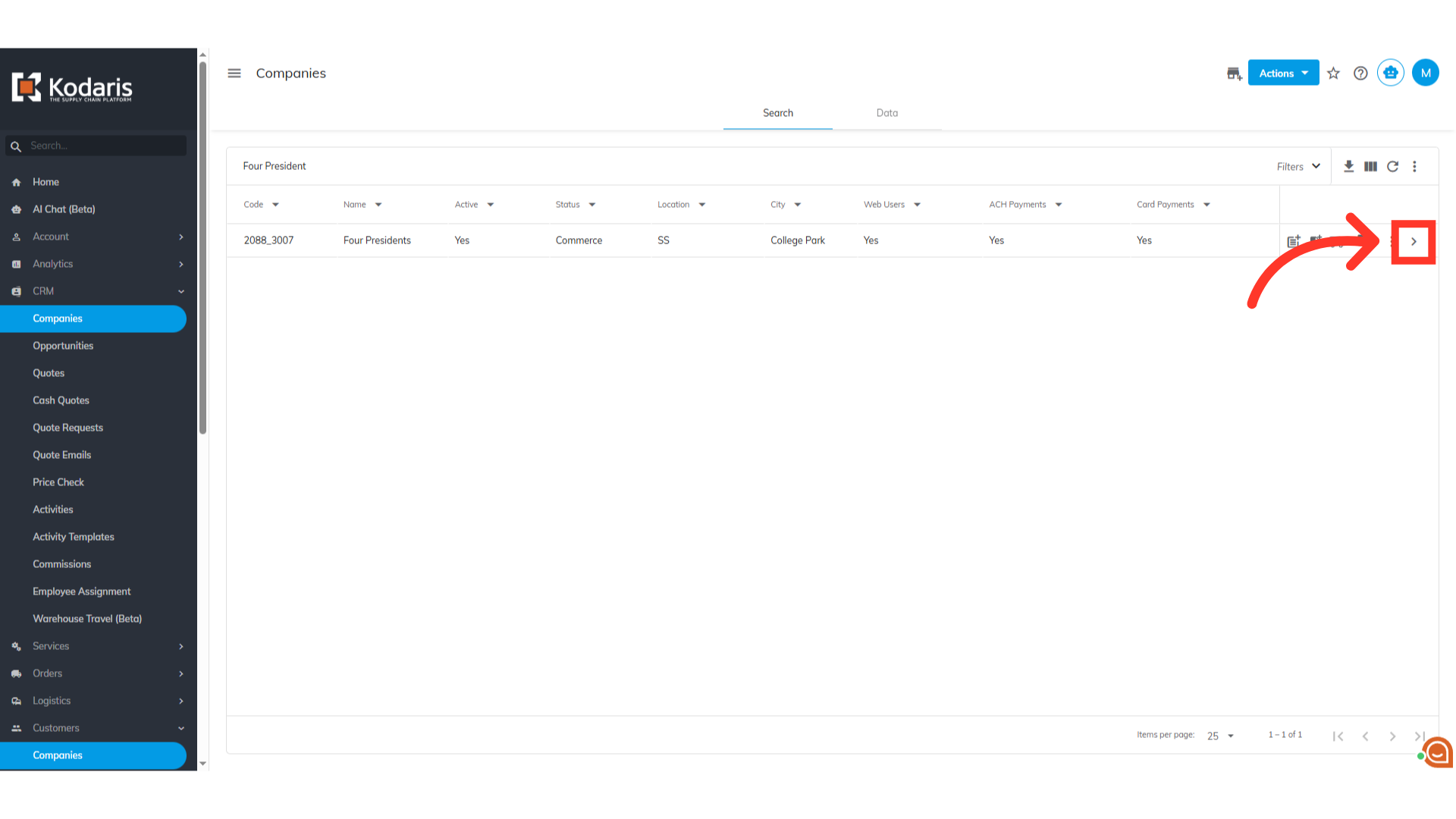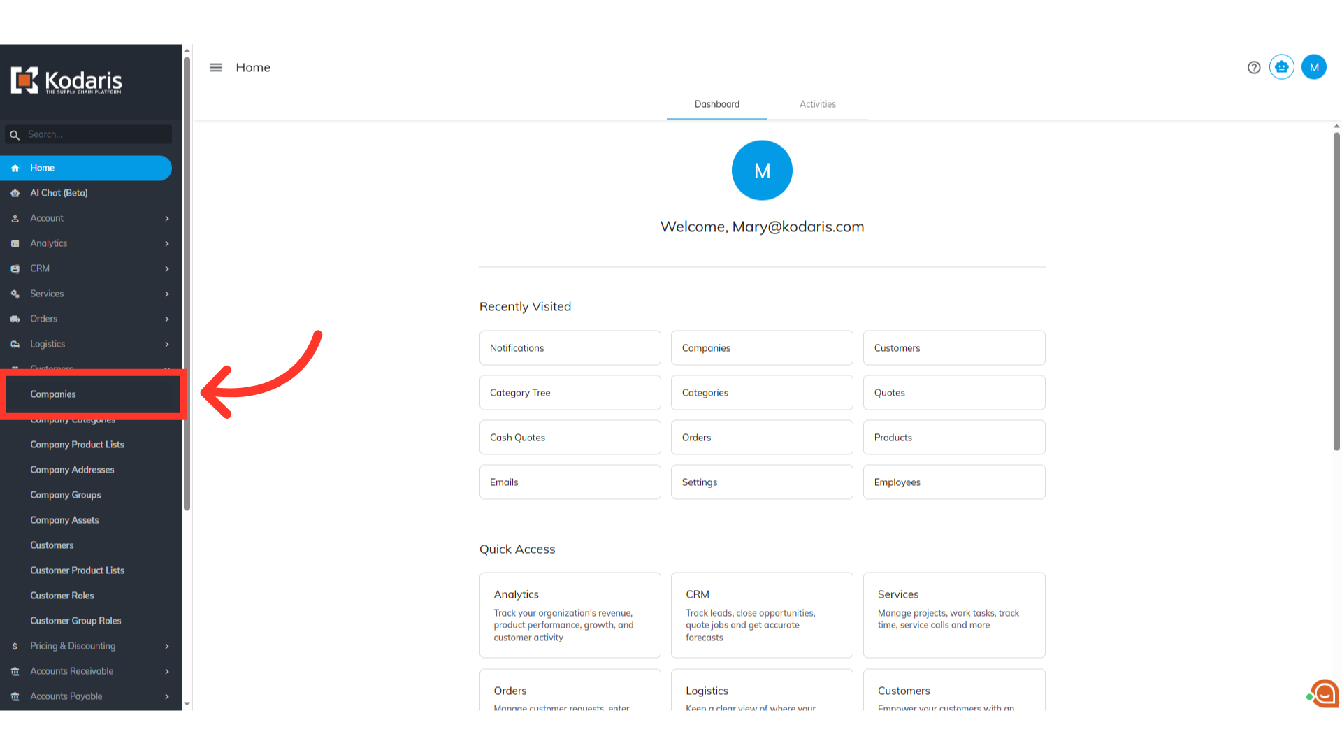 Then, click "Companies". In order to access "Companies" you will need to be set up either as an "administrator" or a "superuser", or have the appropriate roles: "companyView and companyEdit", or "crmCompanyView and crmCompanyEdit". Just a reminder, "crmCompanyView and crmCompanyEdit" access only allows employees to view companies that are assigned to them.