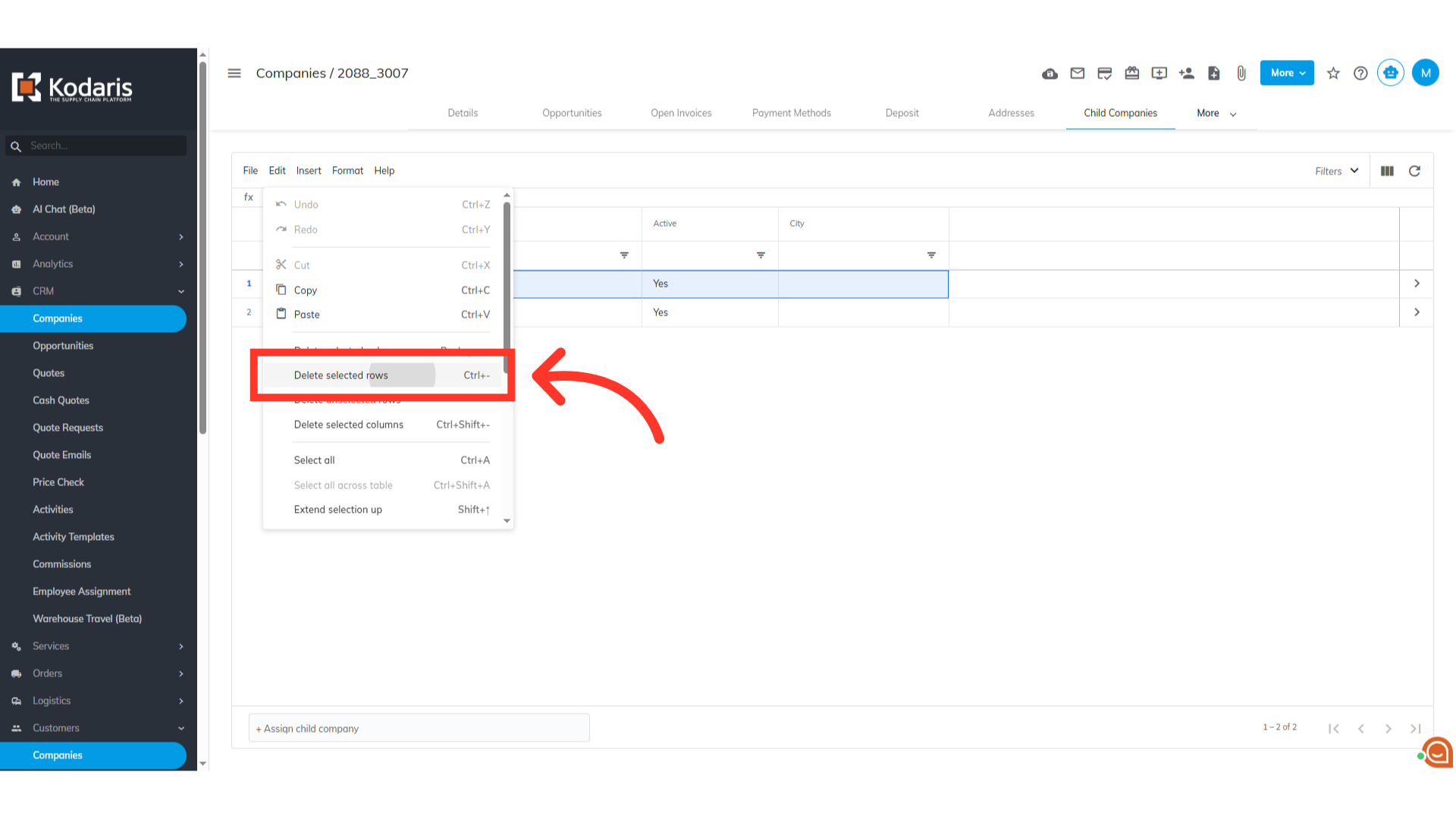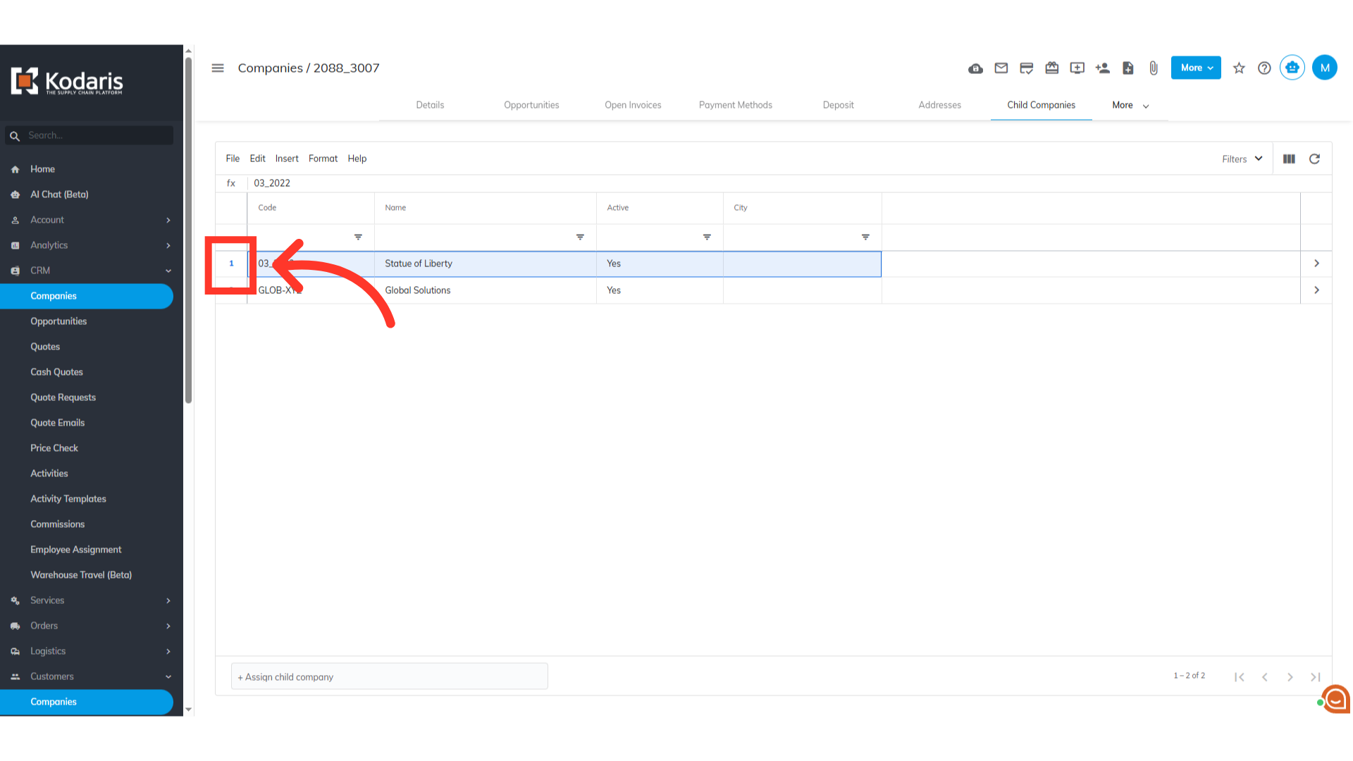 To unassign a child company from the parent company, simply click the number cell to highlight the row.