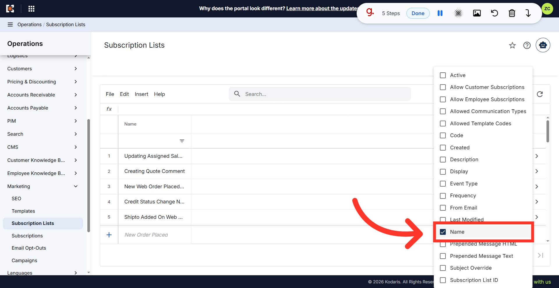 Select the columns that you would like to add to your screen. You can add or hide other columns, depending on what fields you would like to update while using the grid screen. The "Name" column is required when creating a subscription list.