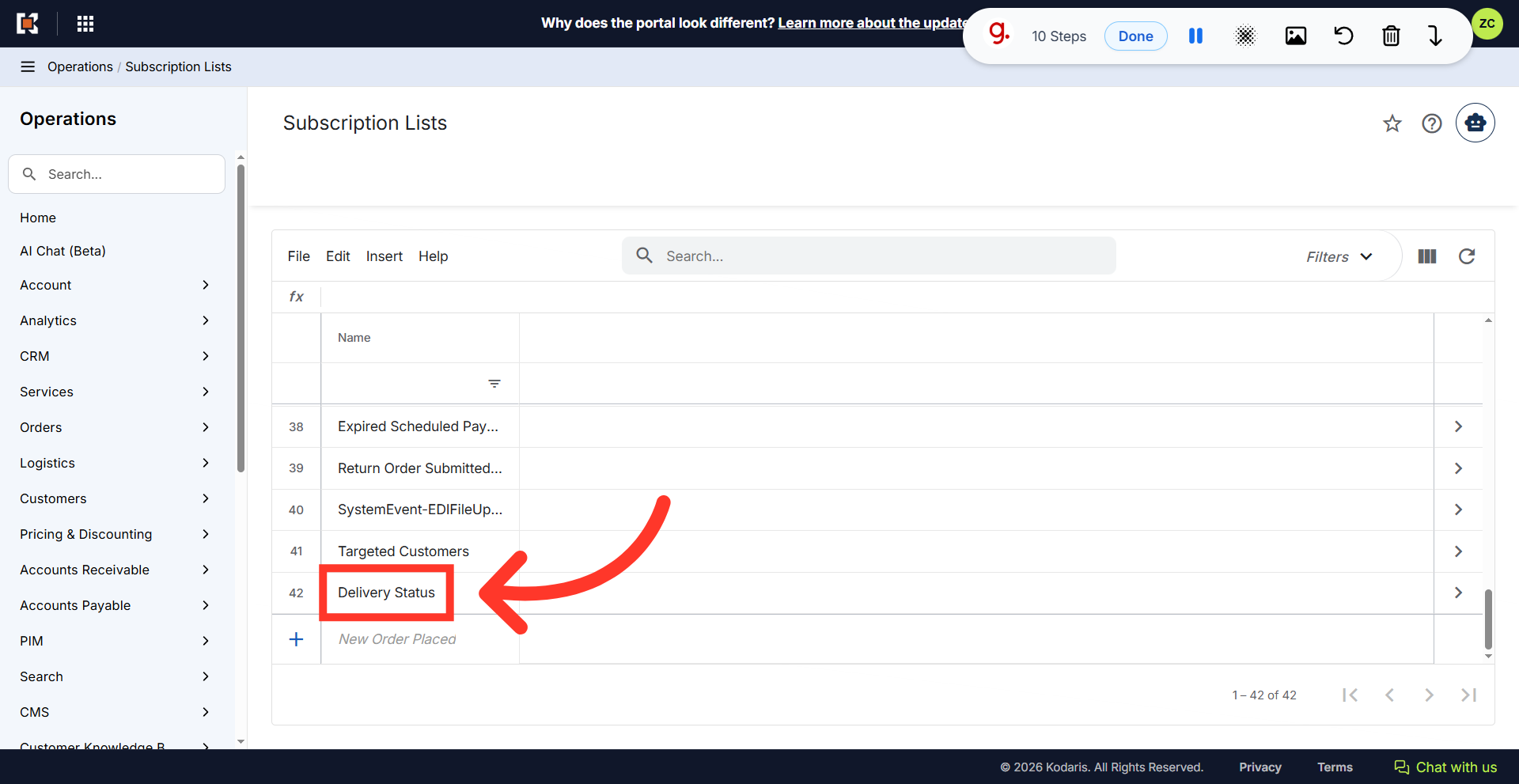 Locate the newly added subscription list in the grid.