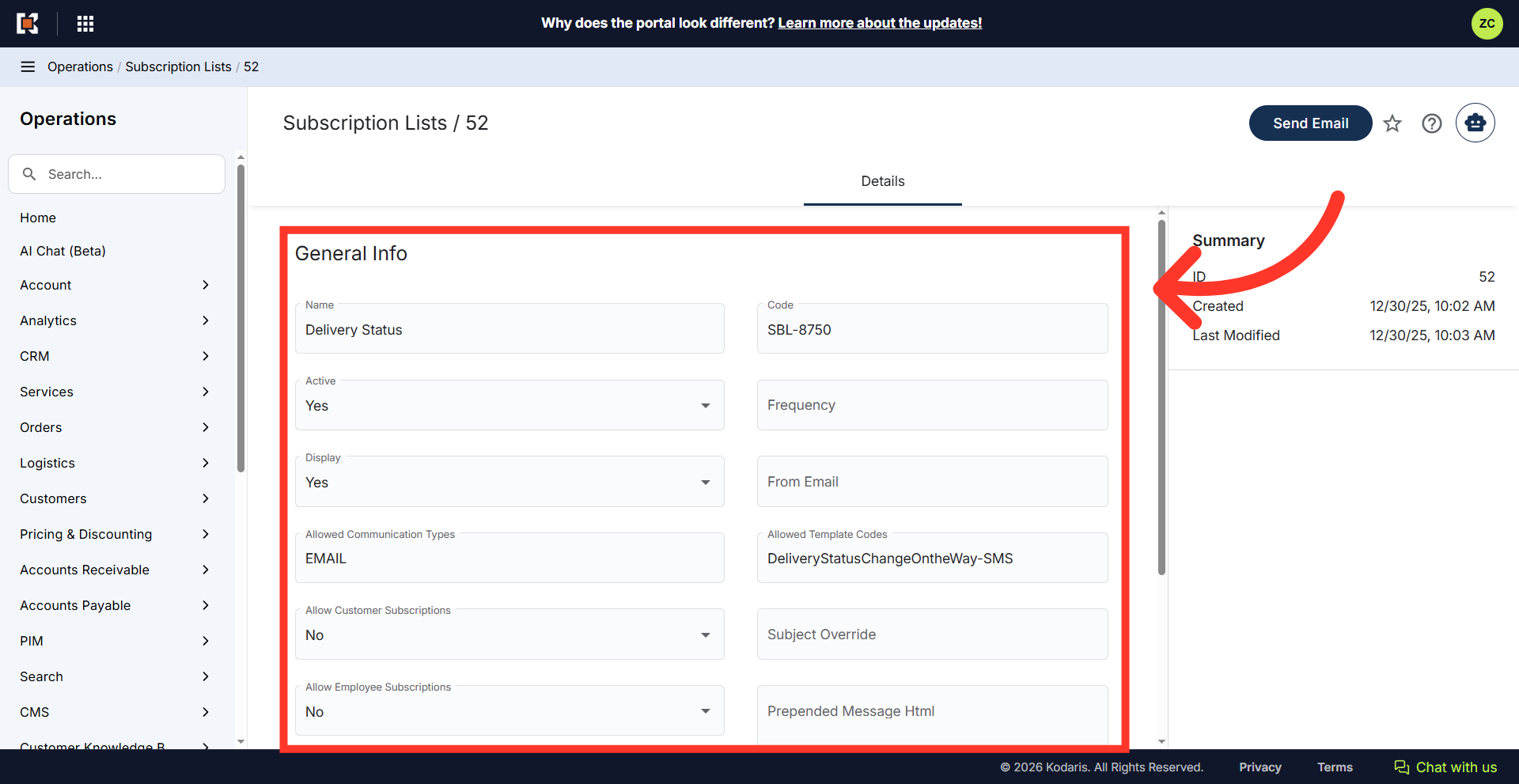 Here you can view general subscription information including active status, allowed communication types, and template settings to ensure proper configuration. Now that you have your subscription list set up, you can use it to mass send email or notification communications.