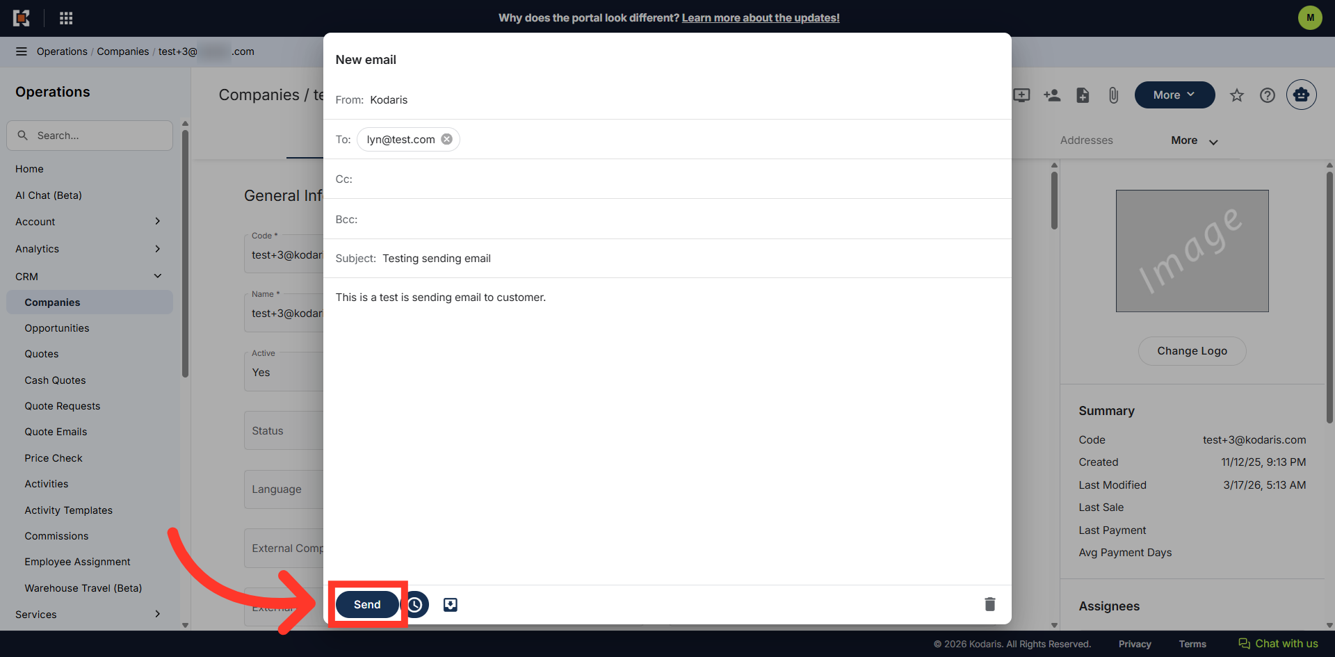 To send emails to a customer account, navigate to the "CRM" section in the Operations Portal.