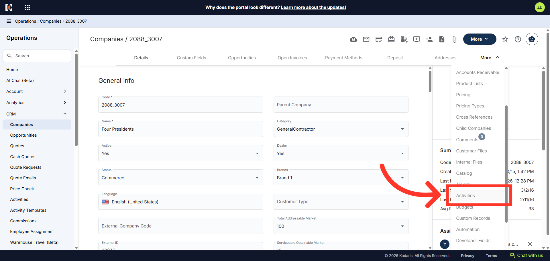 To view all activities associated with a customer, navigate to the "CRM" section in the Operations Portal.