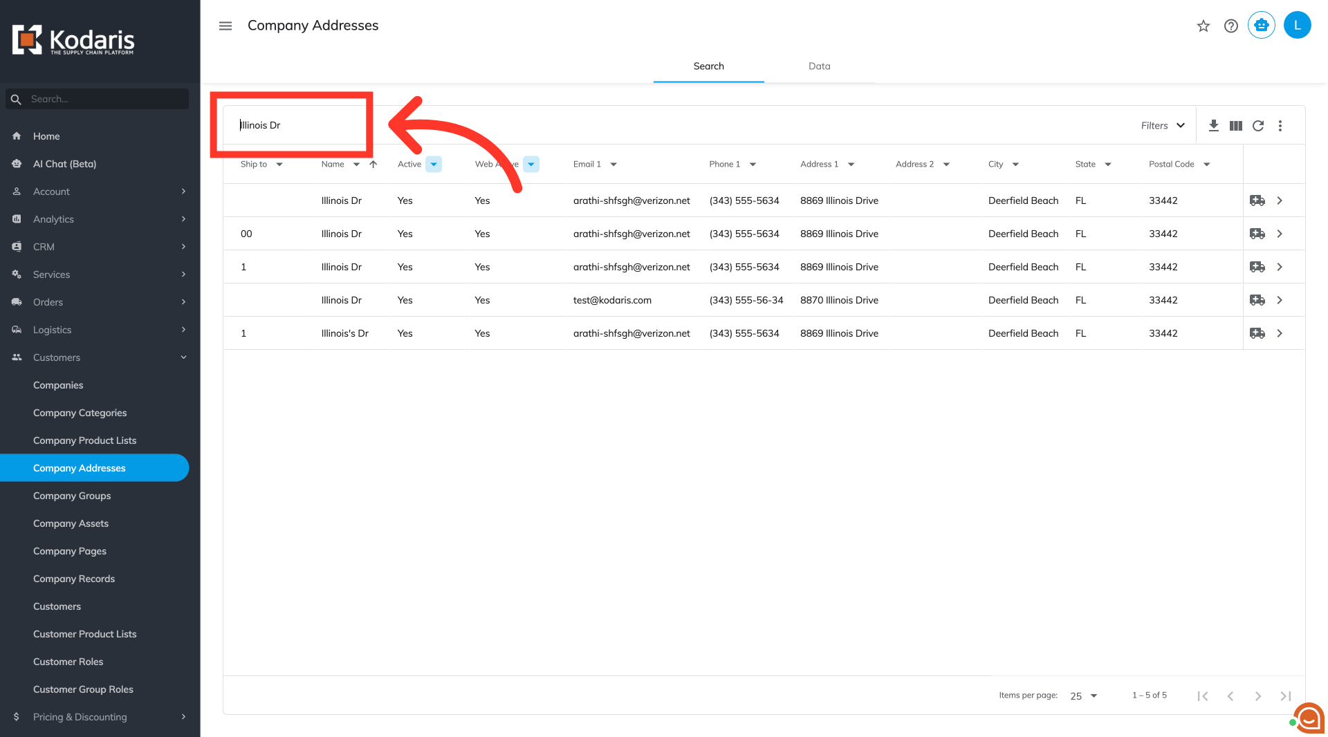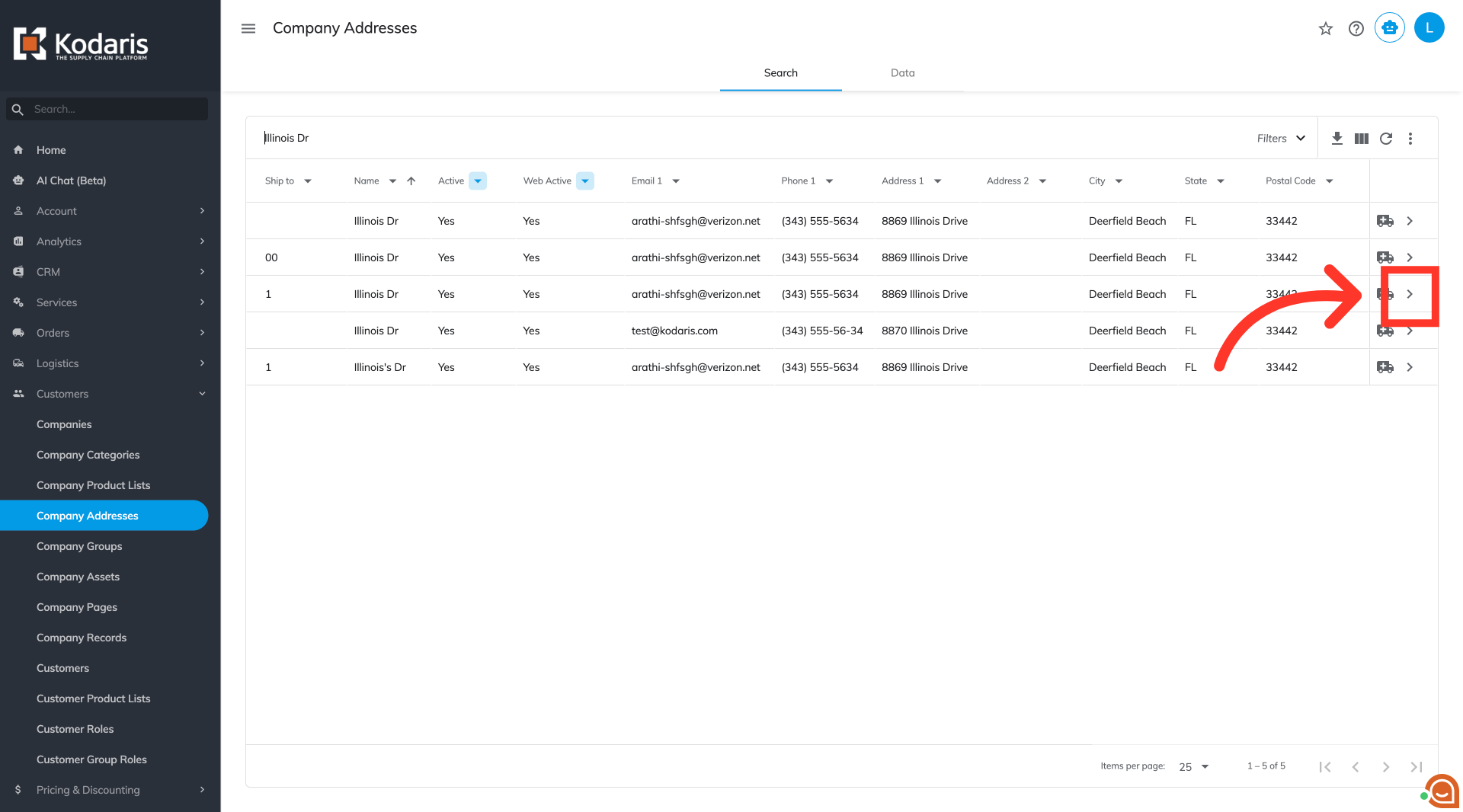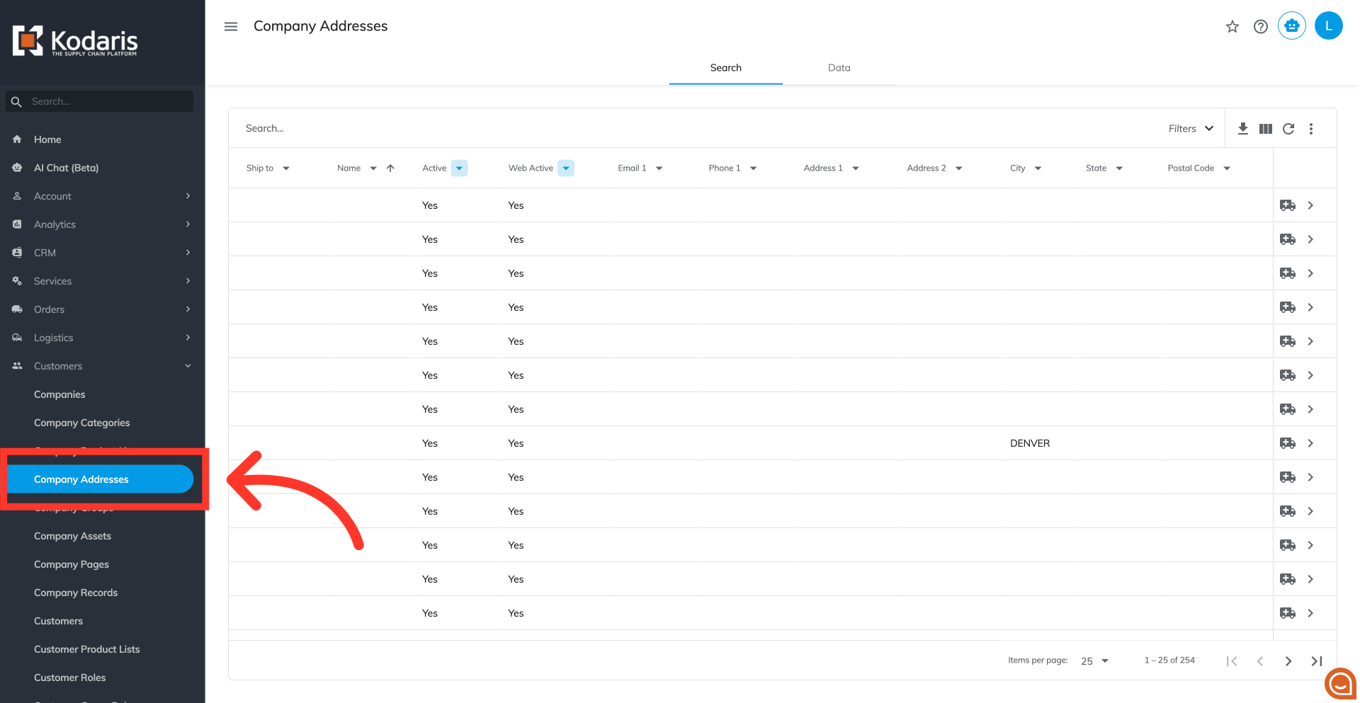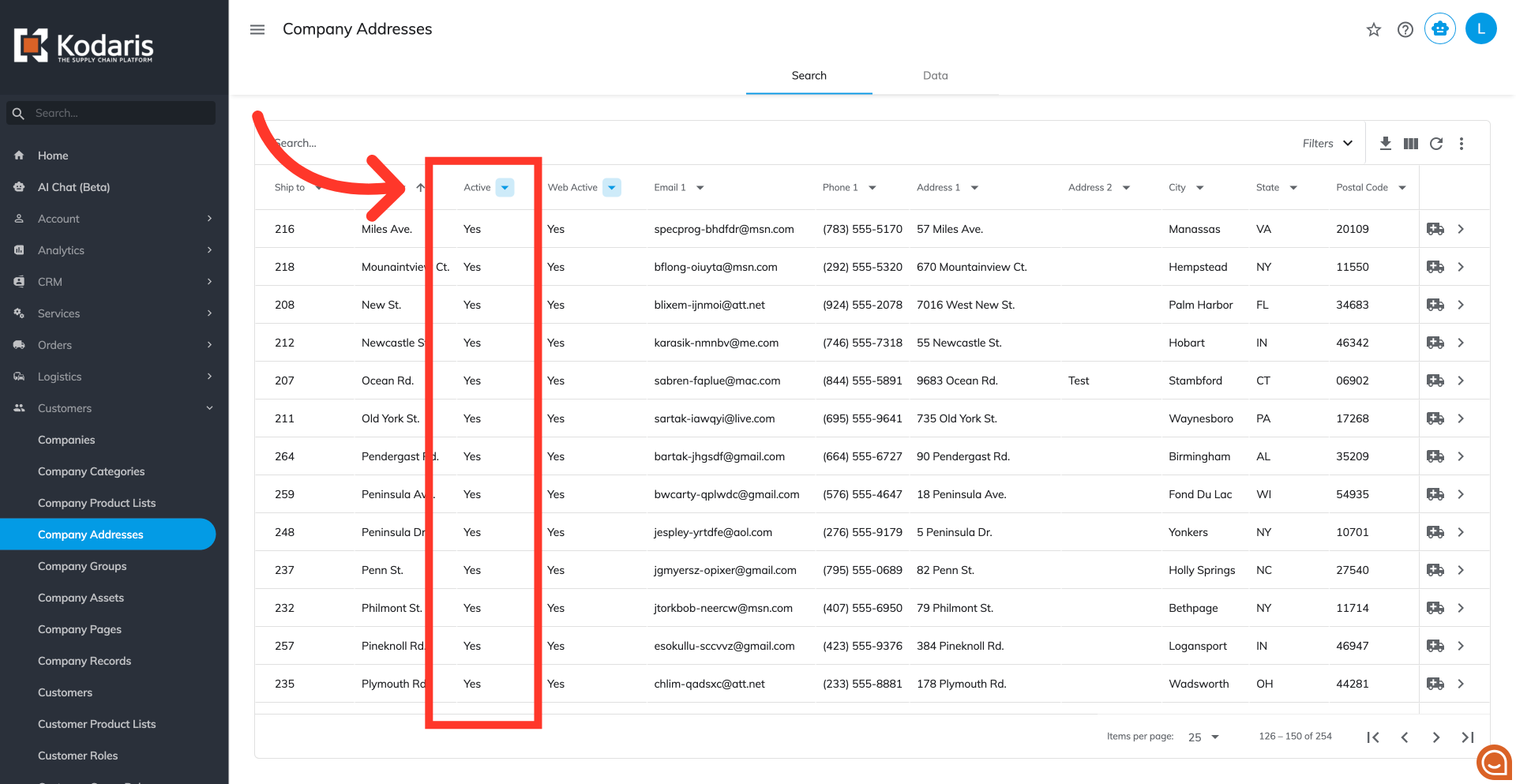 The "Active" column shows the current status (active or inactive) of each ship-to address. If you're using an ERP integration, this status is automatically synced from your ERP system.