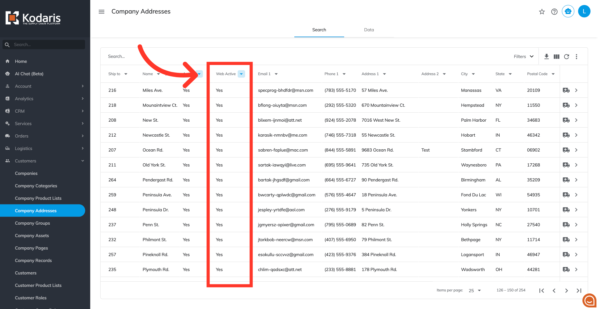 The "Web Active" column manages the visibility of the shipto throughout the commerce website.