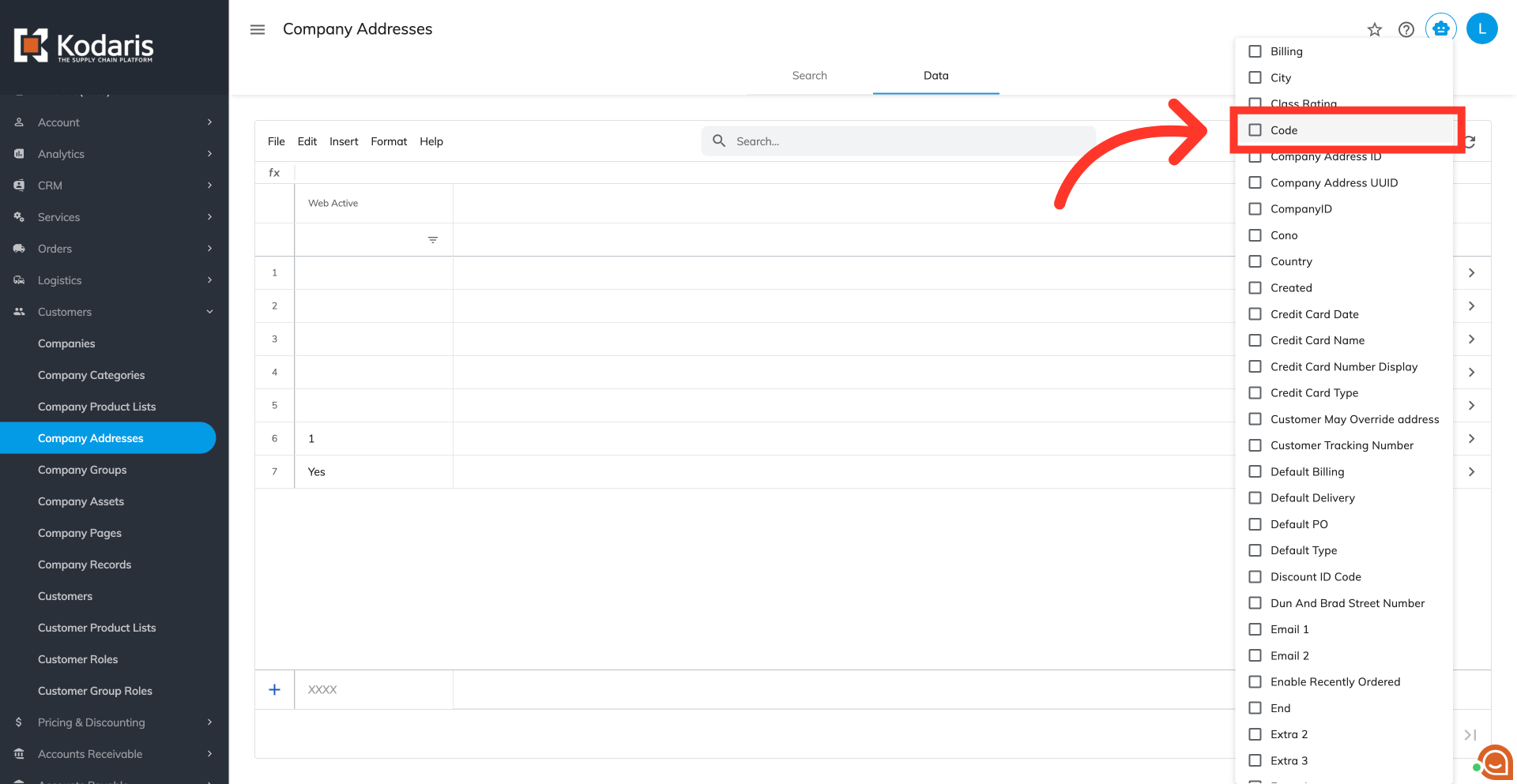 Be sure that the "Code" and "Web Active" columns are selected. These two fields are required for importing. To simplify the export data, you can uncheck any columns that do not need to be updated by import.