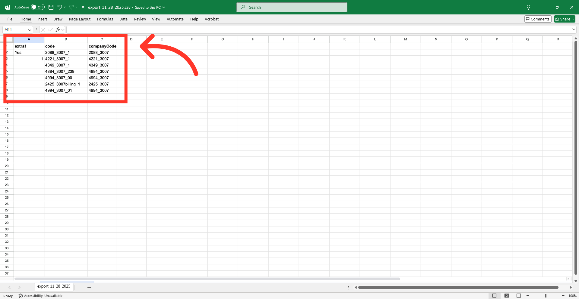 This export will include the "companyCode" column by default. This can be removed as it is not required for the import. Prepare the spreadsheet with the required column headers and data for the import.