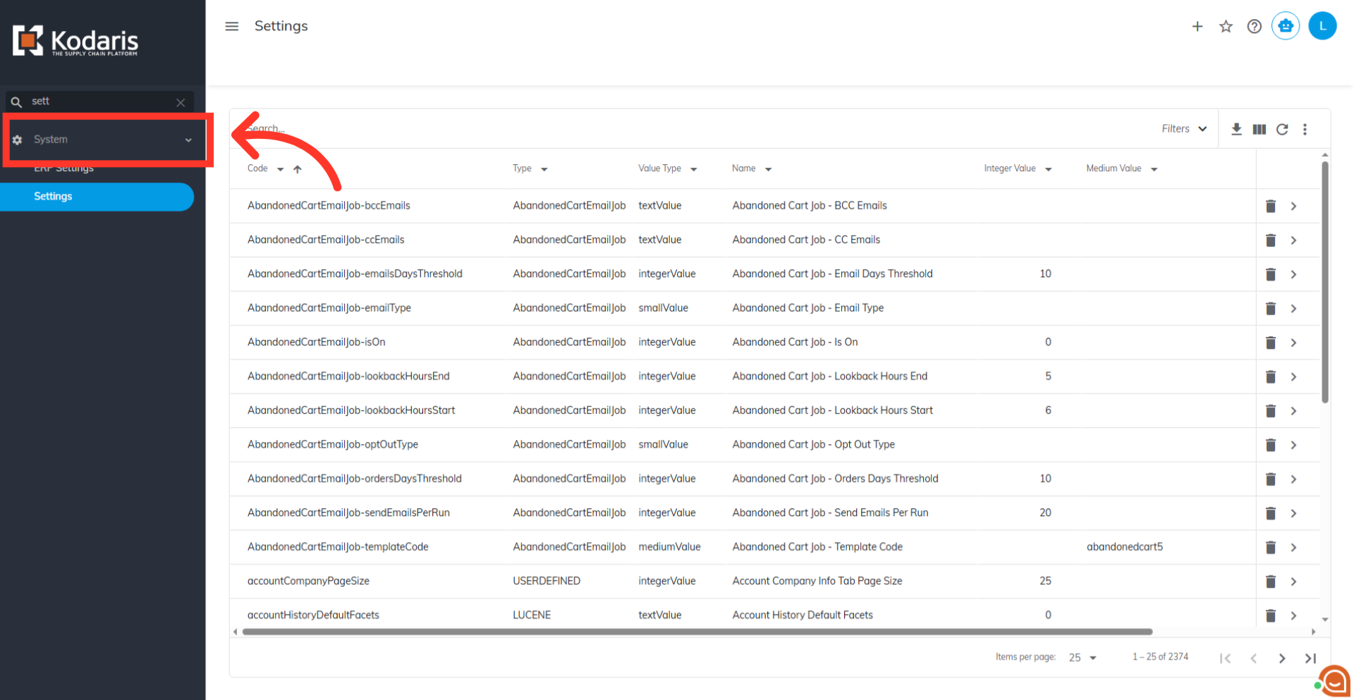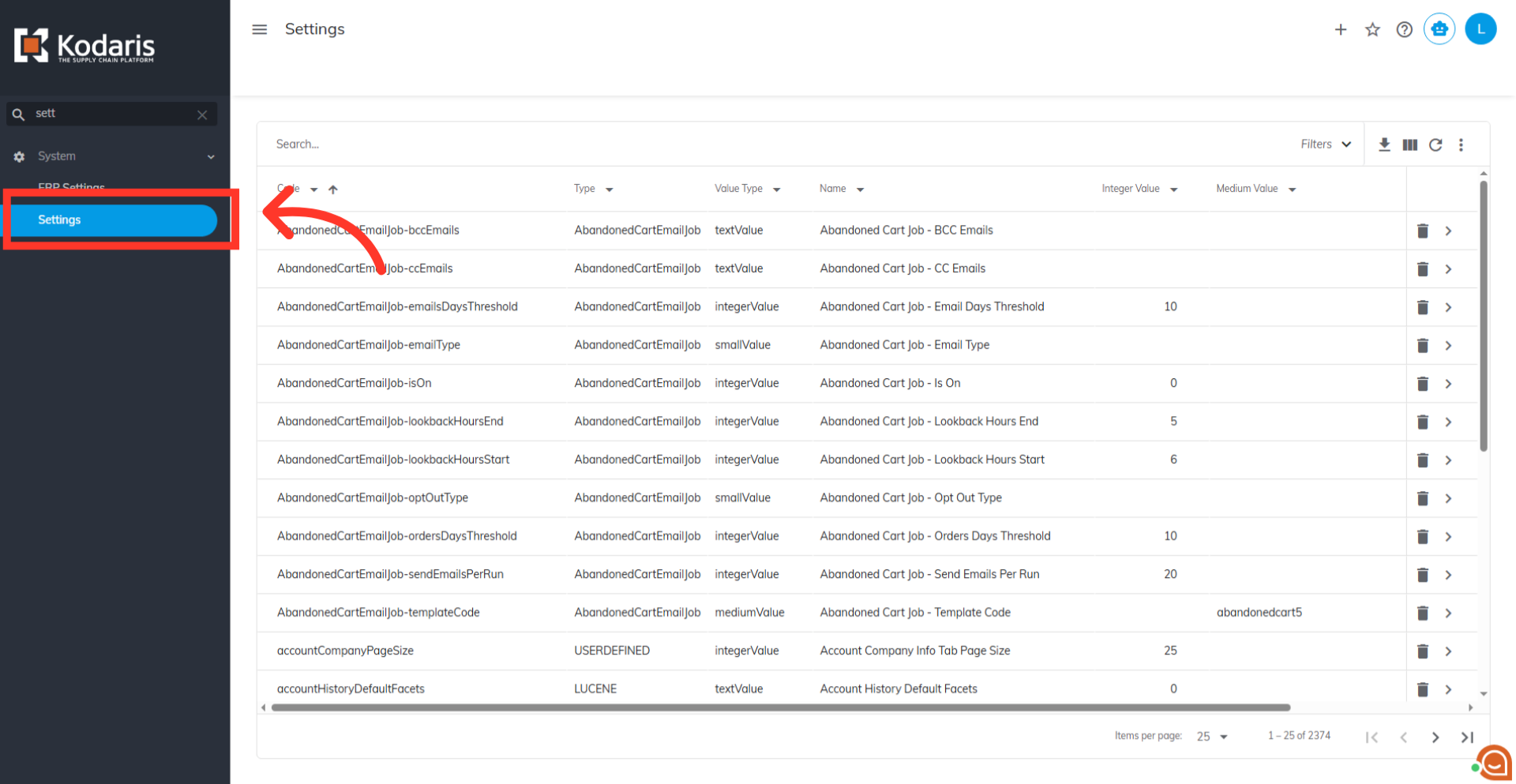Then, select the "Settings" screen. In order to access "Settings" you will need to be set up either as an "administrator" or a "superuser", or have the appropriate roles: "settingEdit," and "settingView."