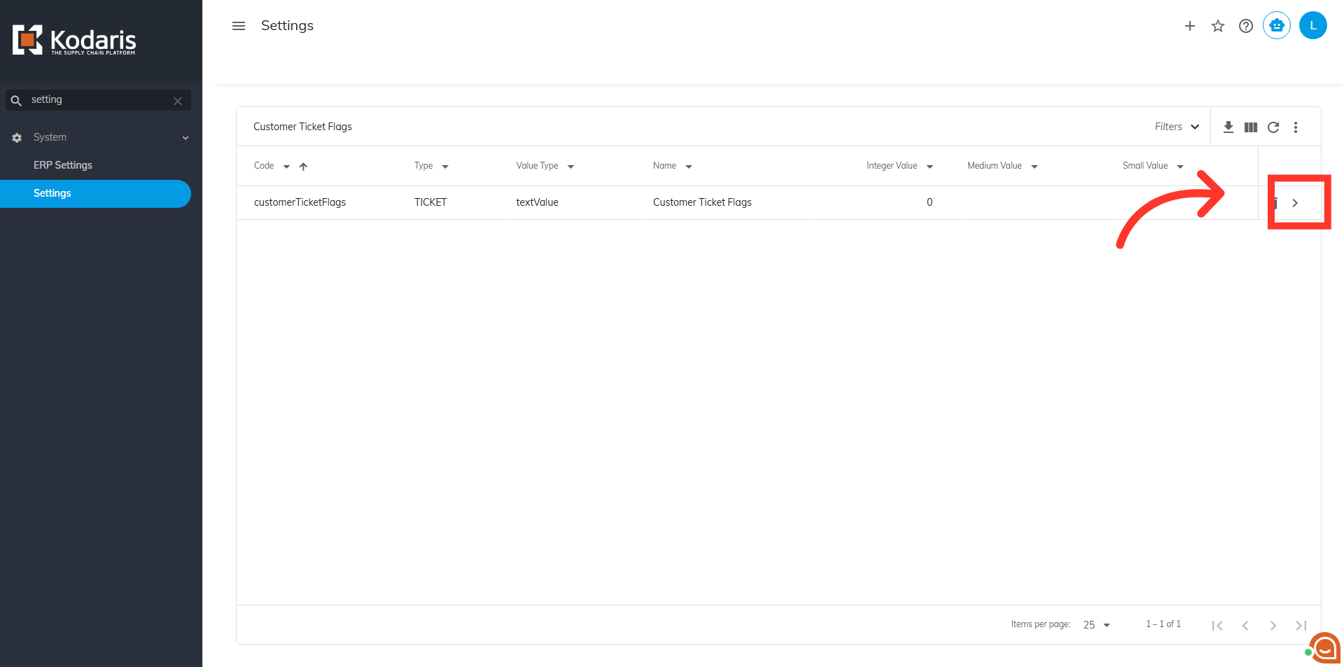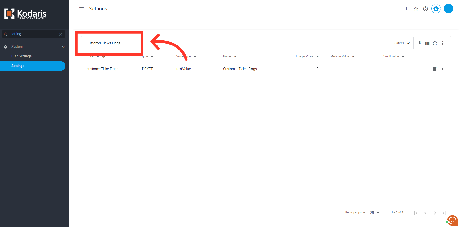 Then, on your “Search” tab, use the search bar or the column filters to narrow down your list and locate the "Customer Ticket Flags" setting. Fill the search bar with "customerticketFlags."