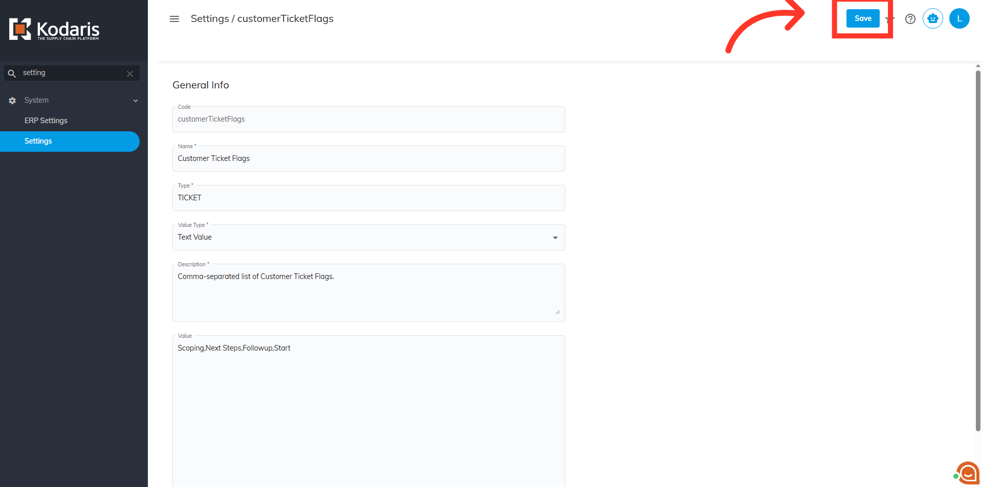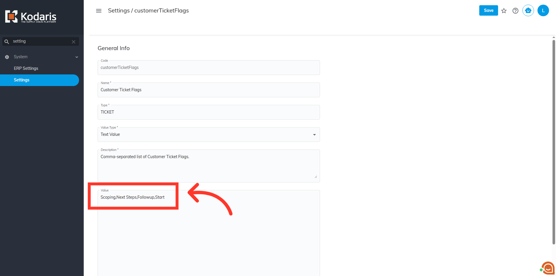 On the details page for the "Customer Ticket Flags" setting, enter your desired values in the "Value" field, separated by commas.