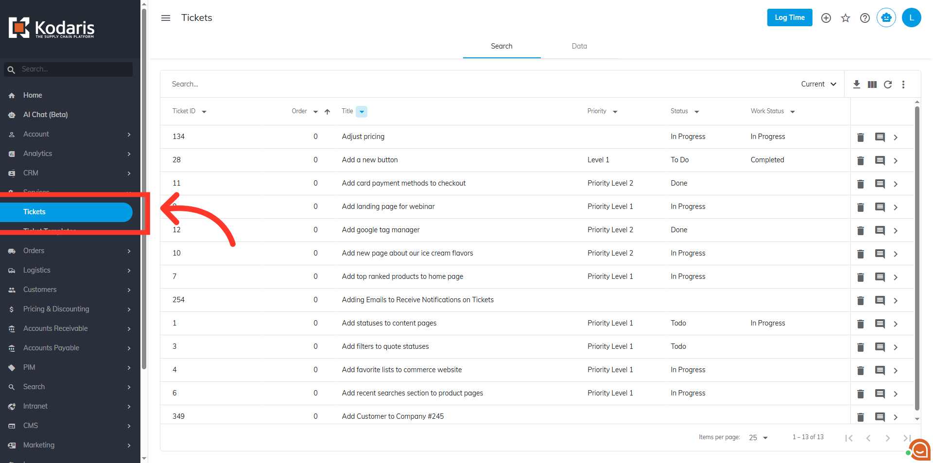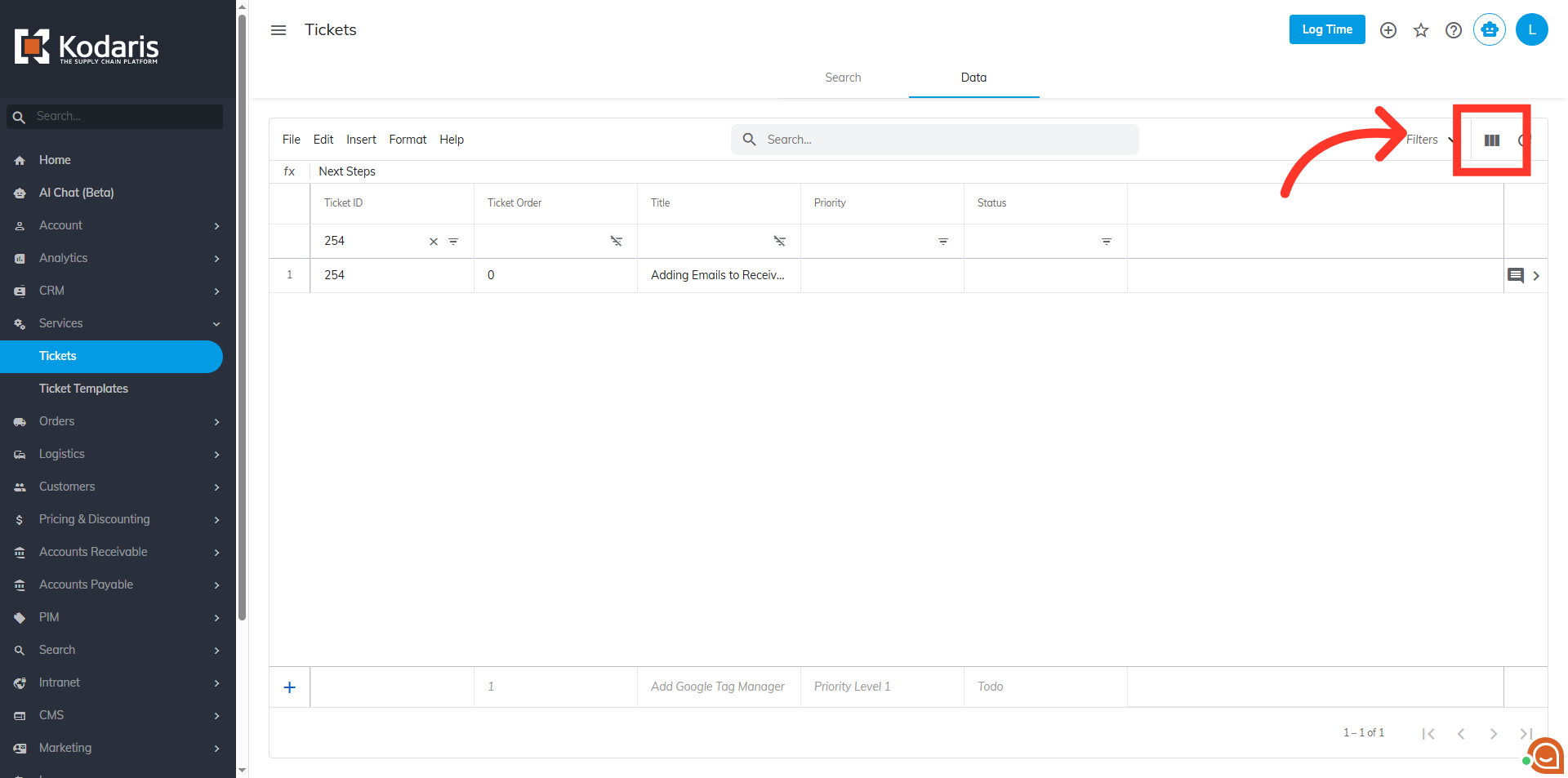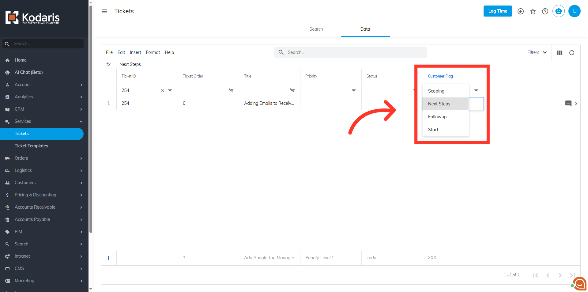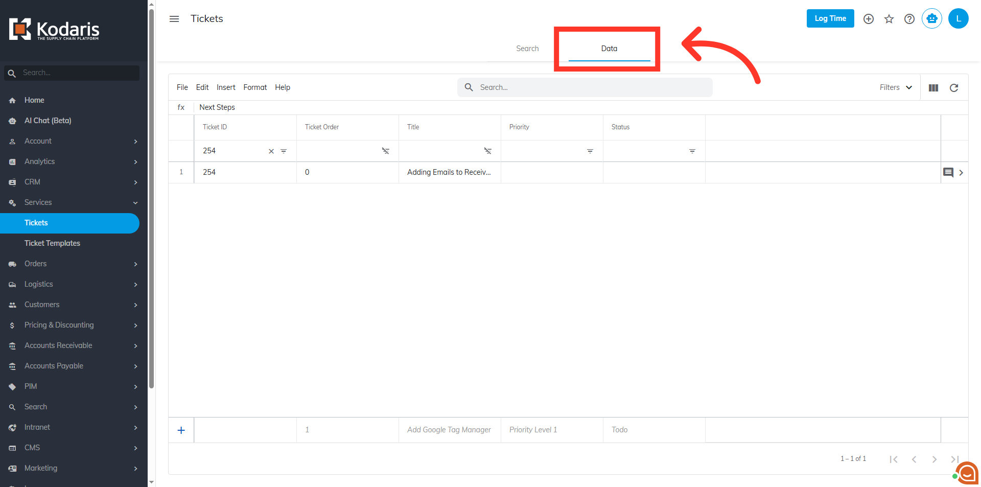 You can also go to the "Data" tab of your "Tickets" screen to change the values from the grid. This can be helpful if you would like to update multiple tickets when using the data grid.