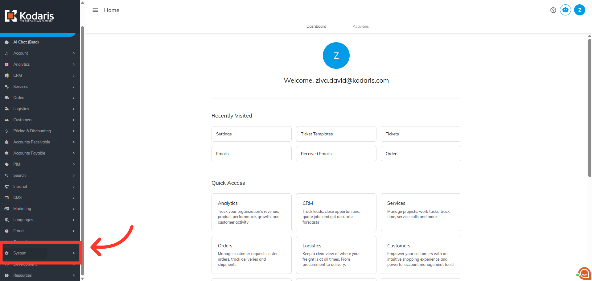 To configure the displayed reply-to email address on emails sent from your system, first navigate to the "System" section in the Operations Portal.