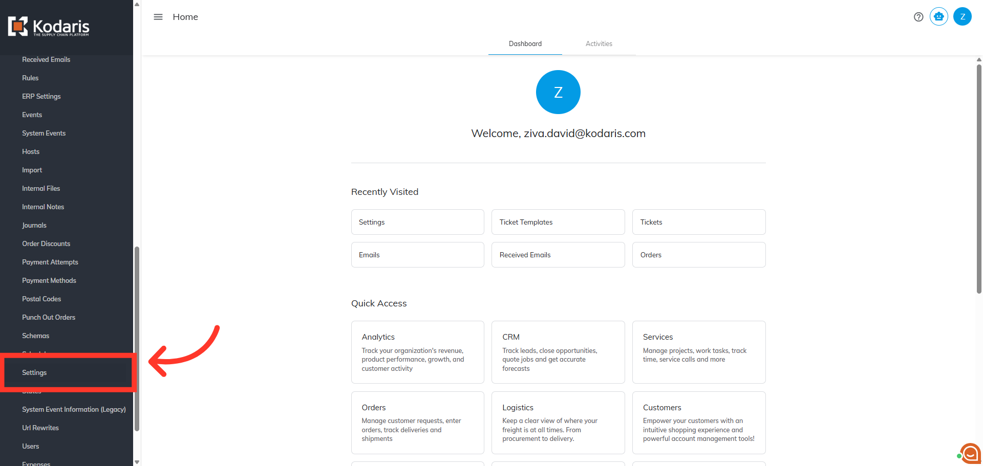 Then, click "Settings". In order to access and edit settings, you will need to be set up either as an “administrator” or a "superuser", or have the following roles: "settingEdit" and "settingView".