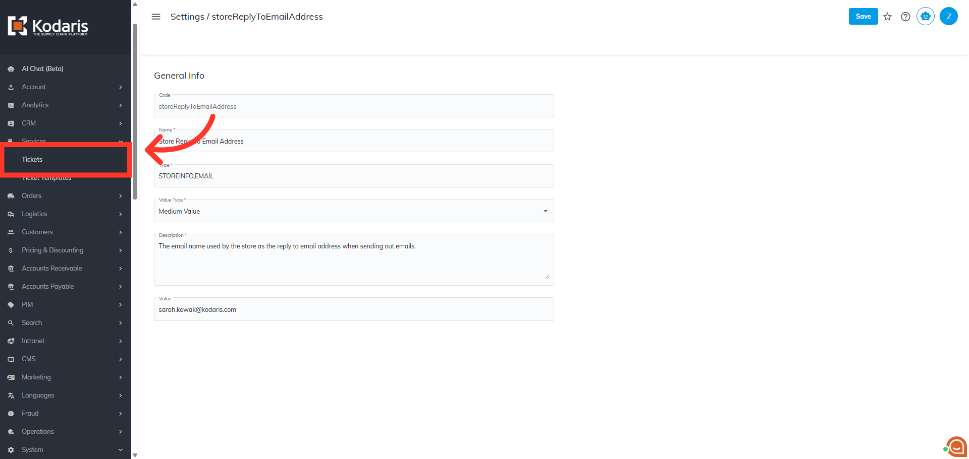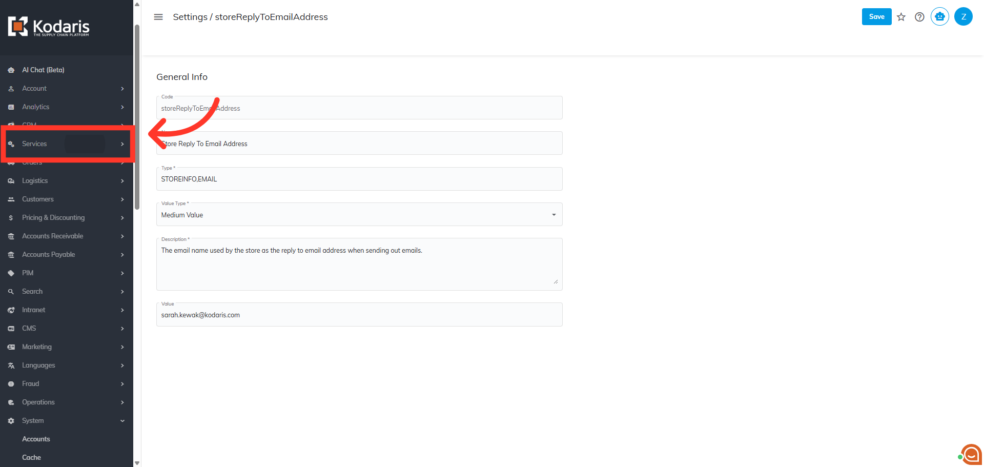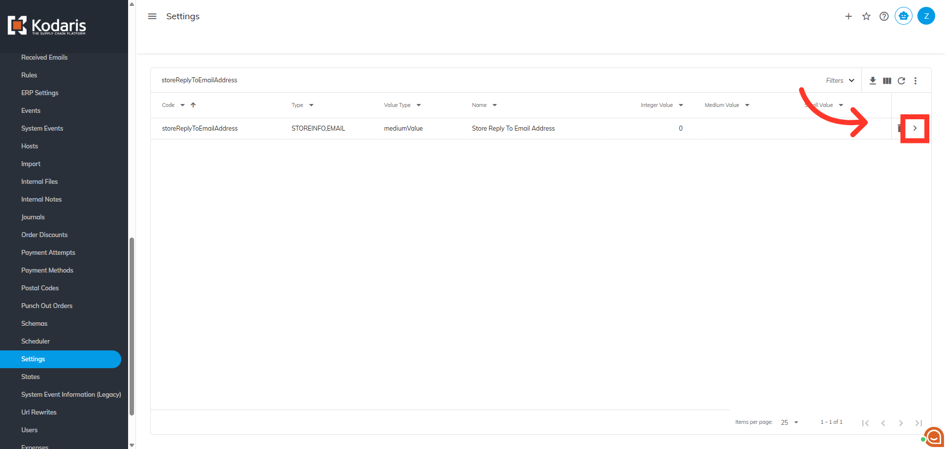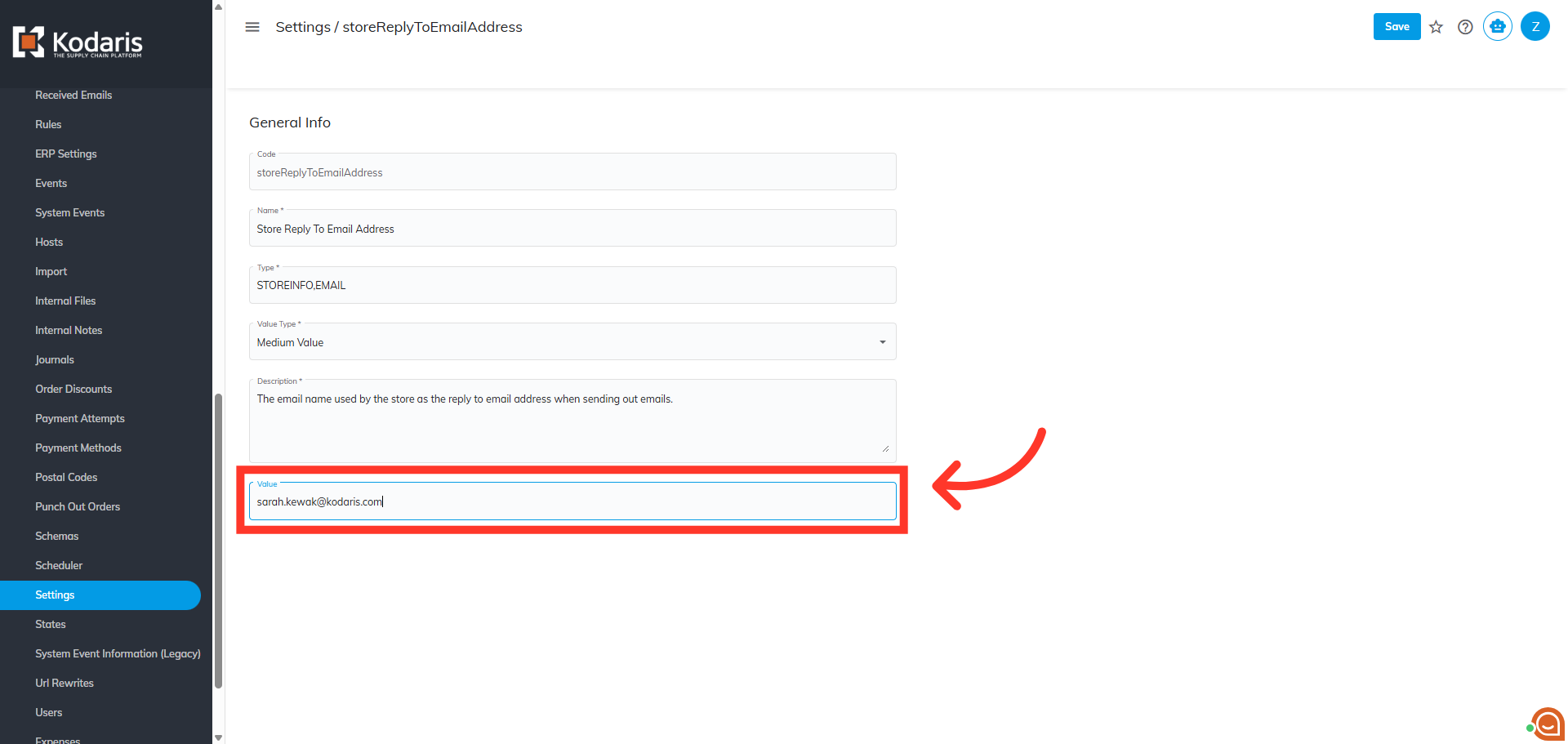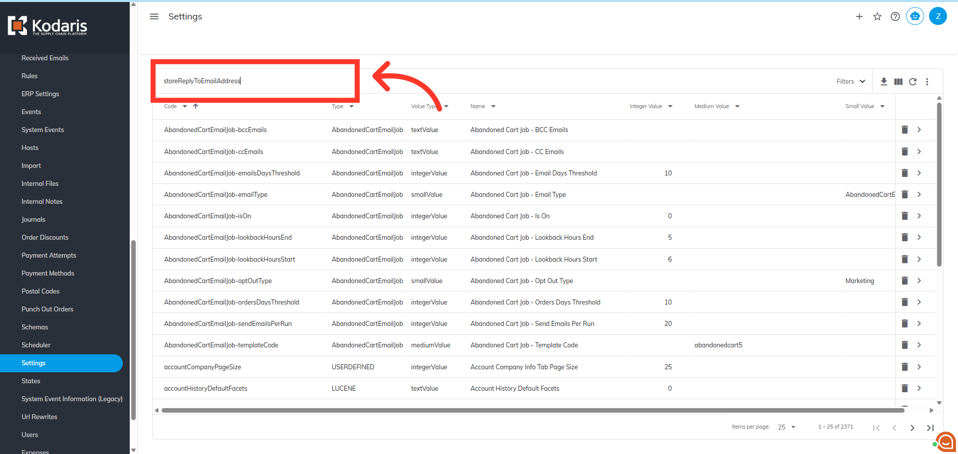 Next, click in the "Search" box and search for the "storeReplyToEmailAddress" setting.