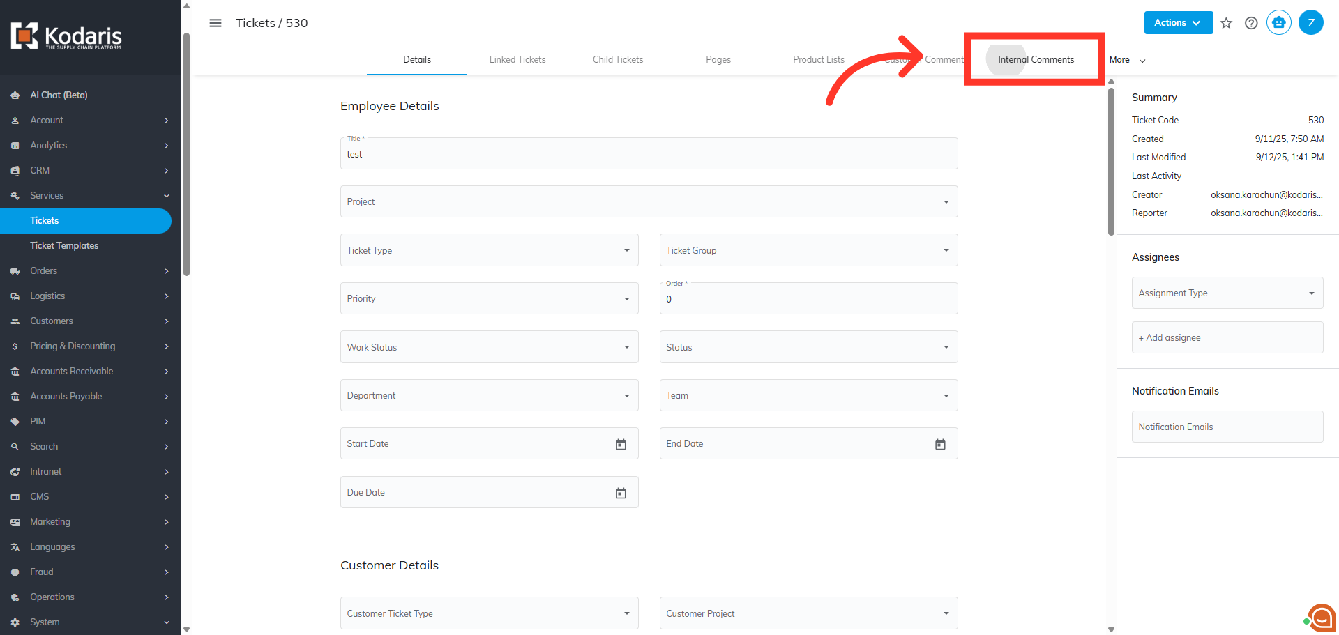 Nex, click the "Internal Comments" tab.
