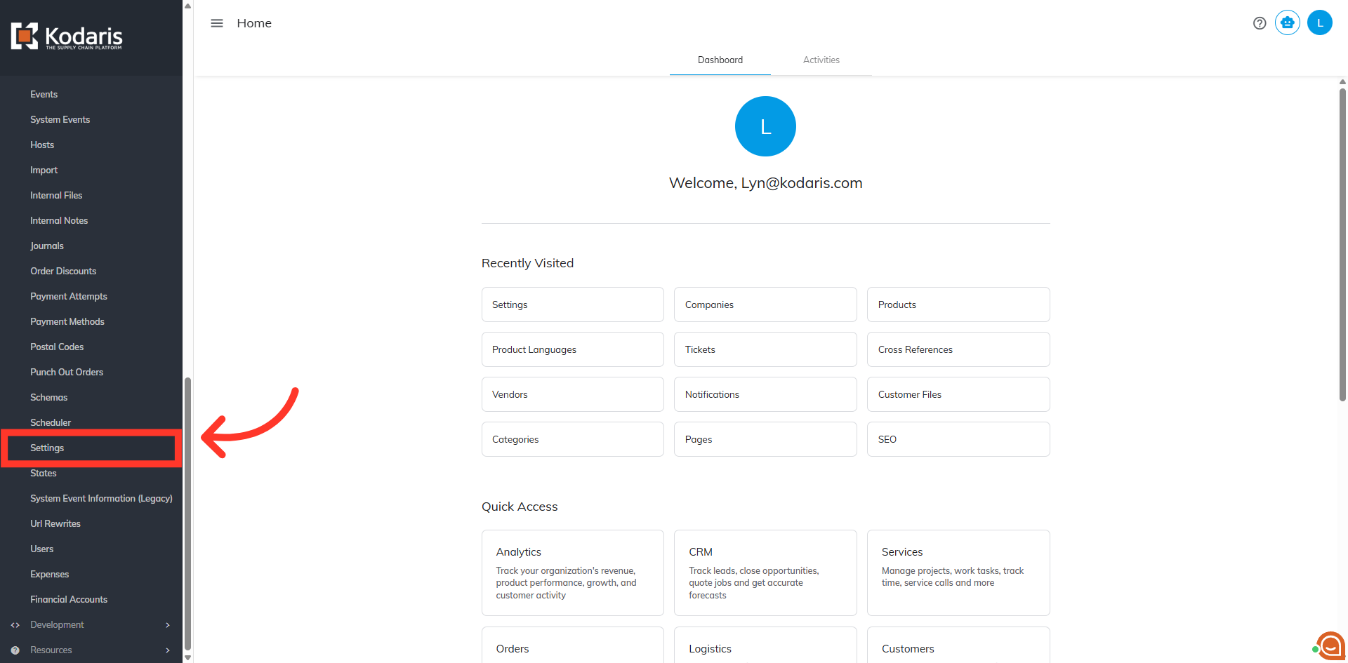 Click "Settings". In order to access and edit settings, you will need to be set up either as an “administrator” or a "superuser", or have the following roles: "settingEdit" and "settingView".