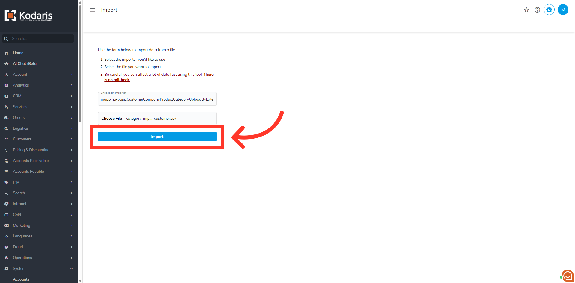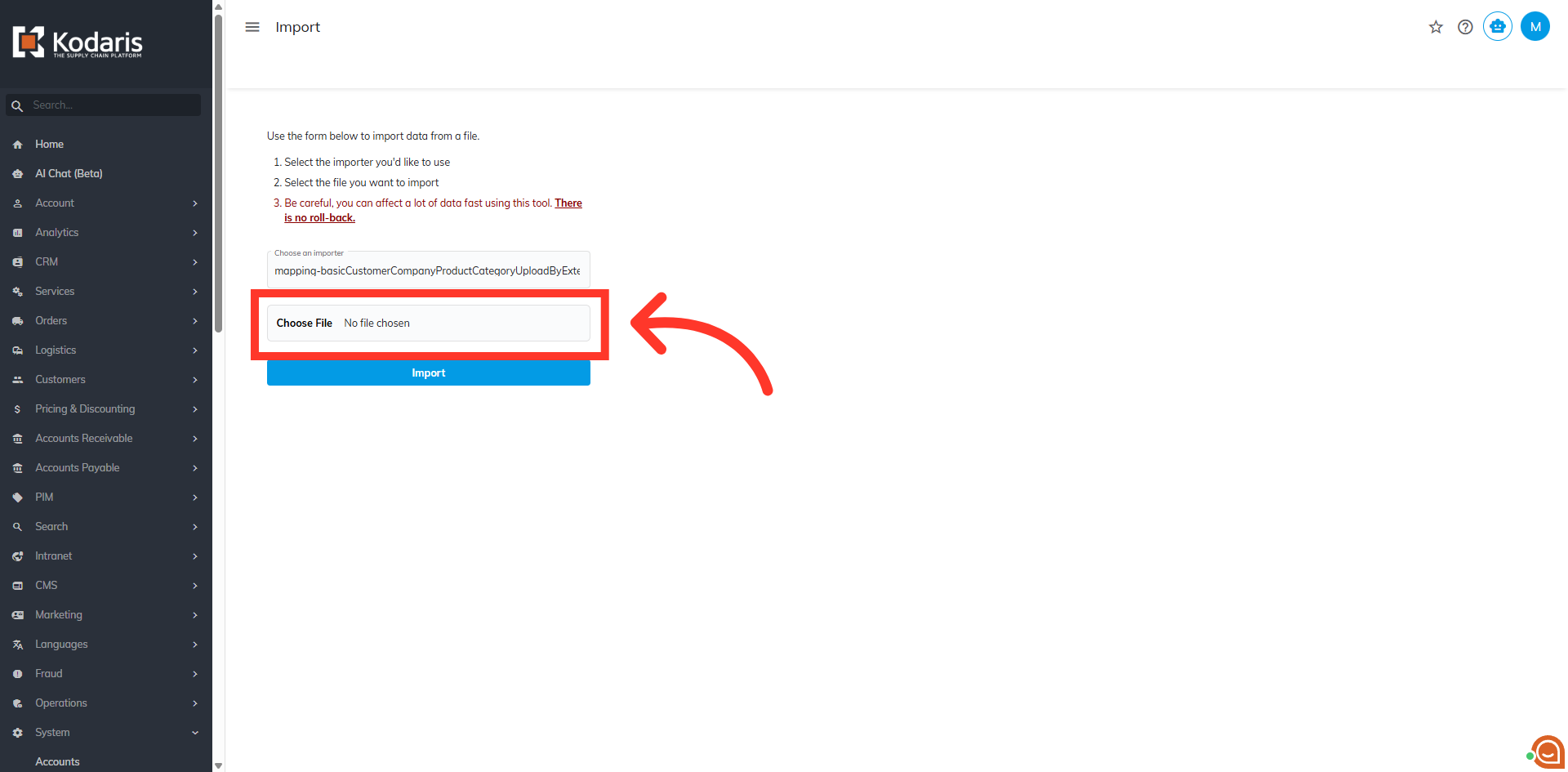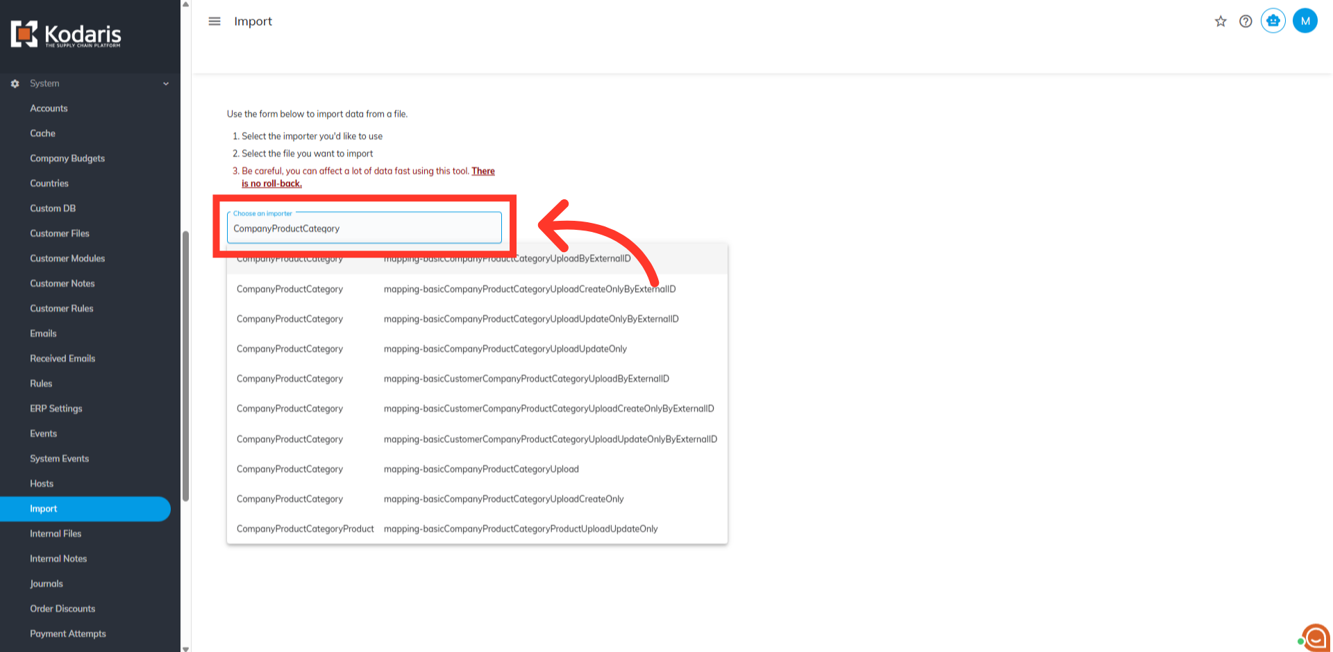 Enter "CompanyProductCategory" in the "Choose an importer"field.