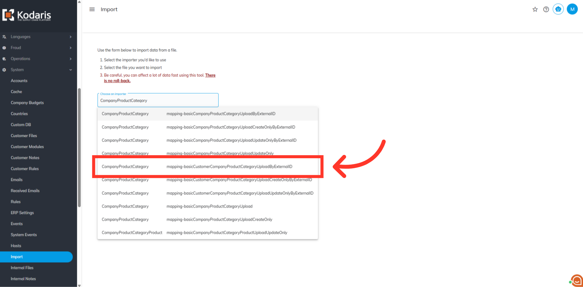 Different importers under company product category will show. Select the "mappingbasicCustomerCompanyProductCategoryUploadByExternalID".