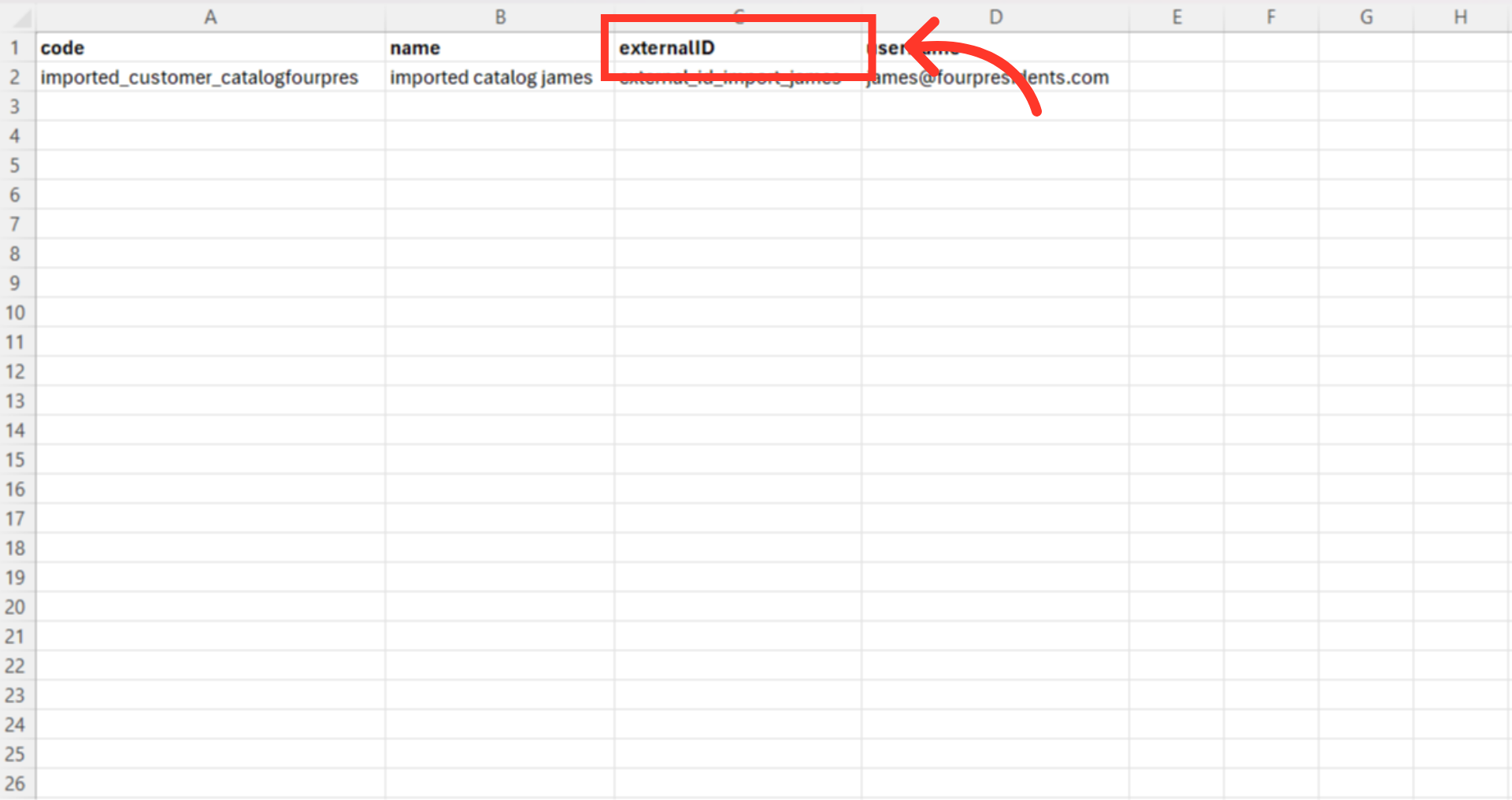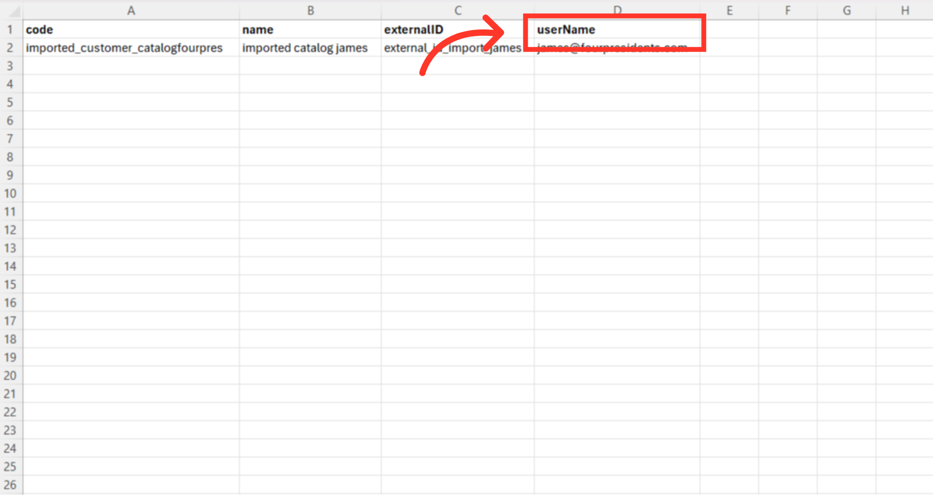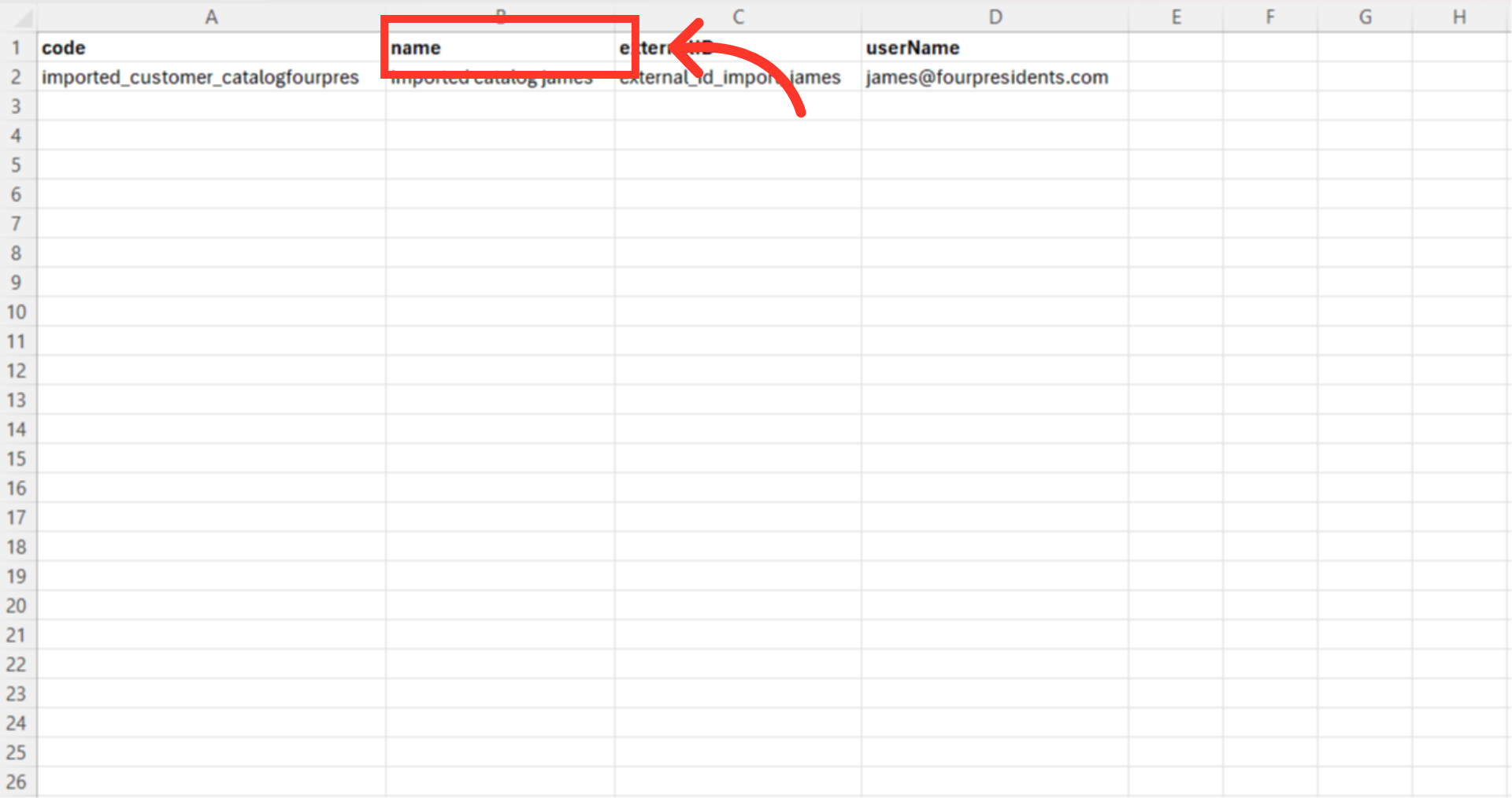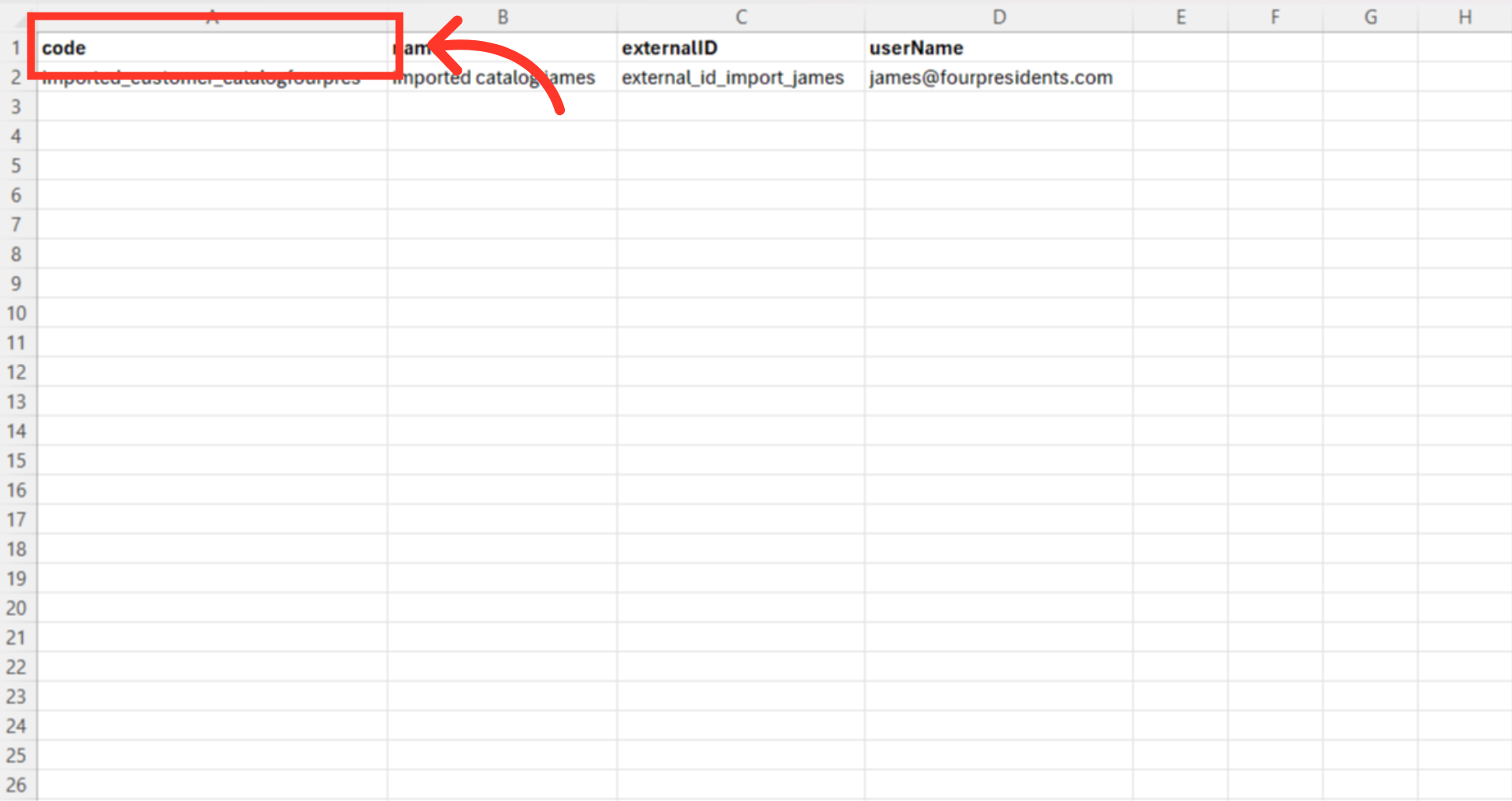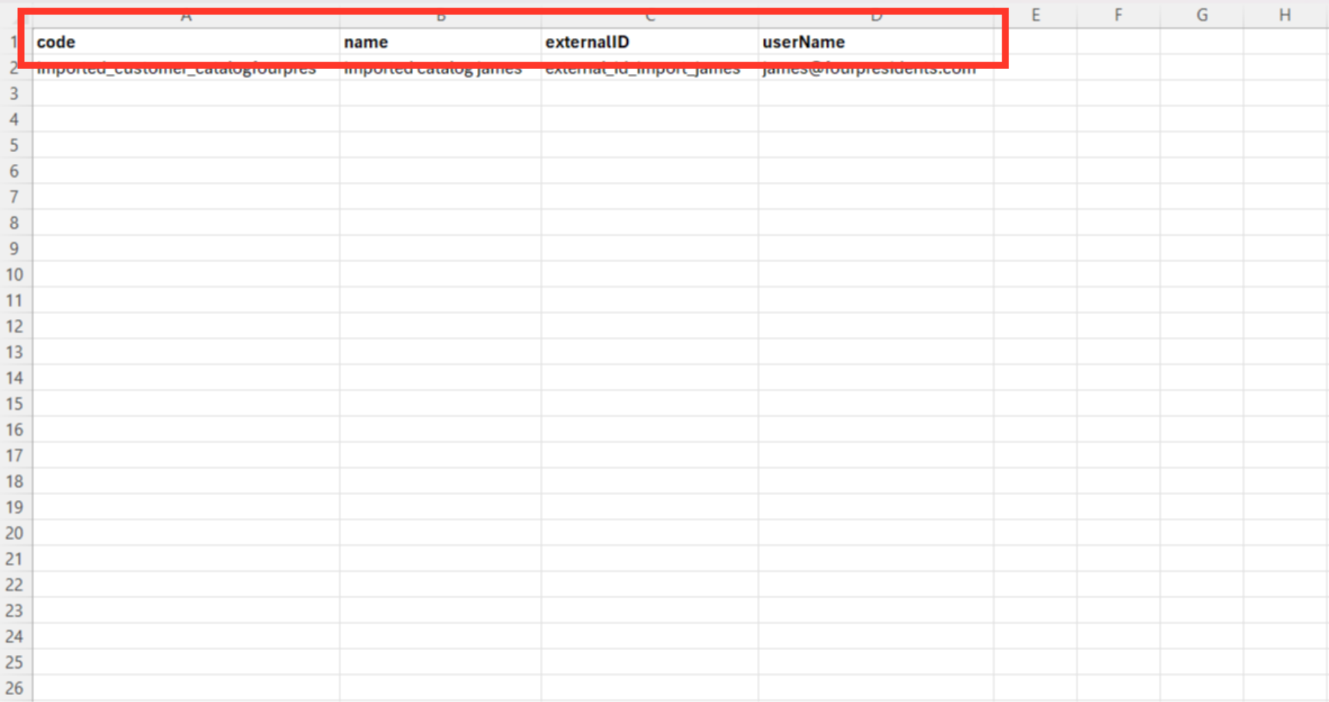 Prepare your CSV file. It should have these column headers: "code", "name", "externalID", and "userName".