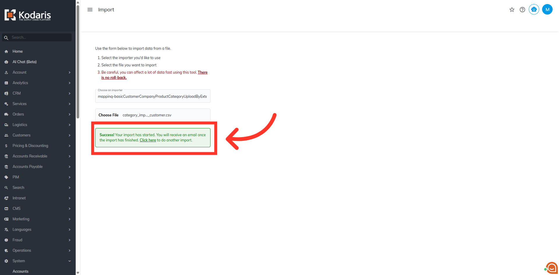 A success message will show that your import has started. If you are importing large amounts of data, it may take a short amount of time to complete. The import will continue to run in the background.