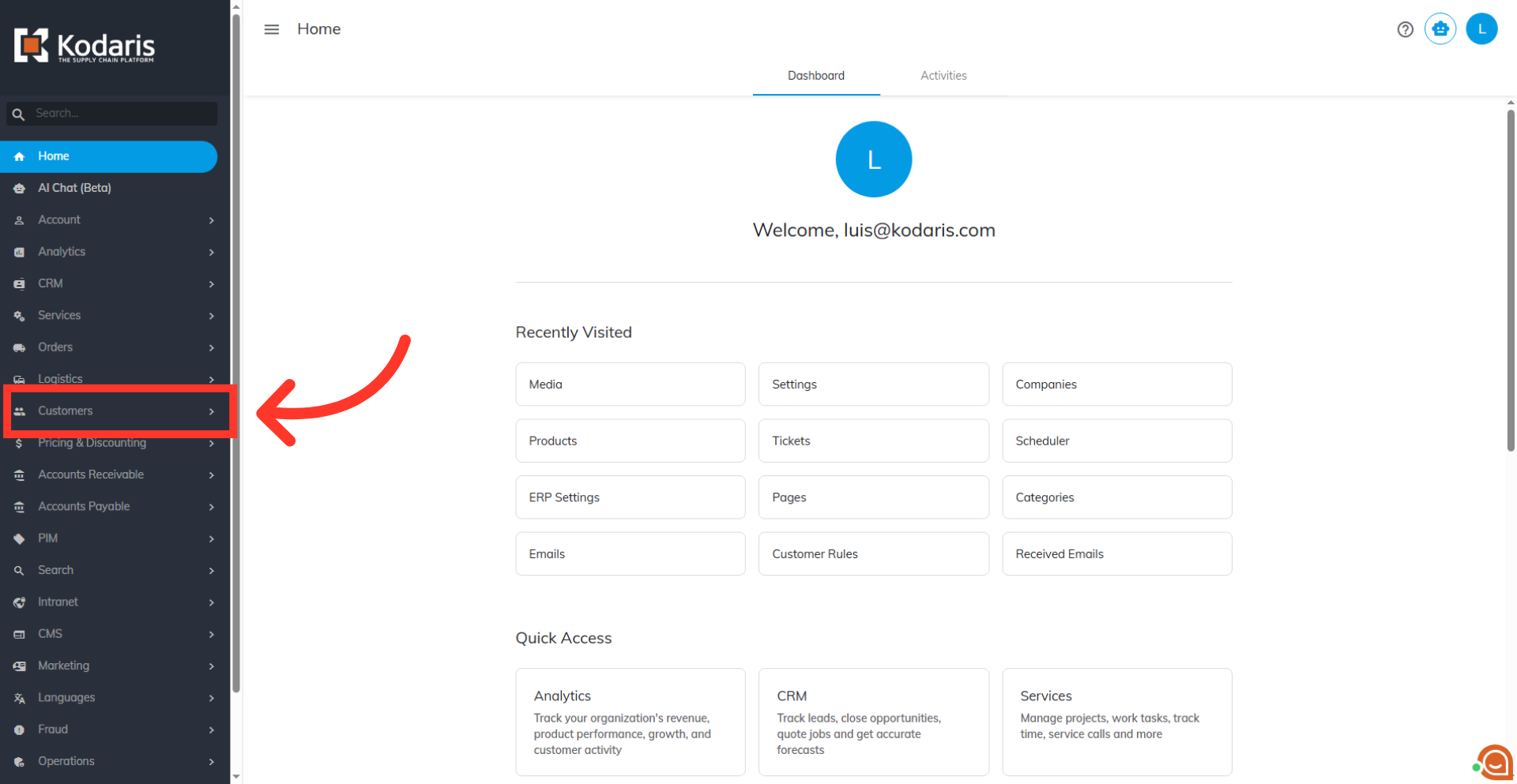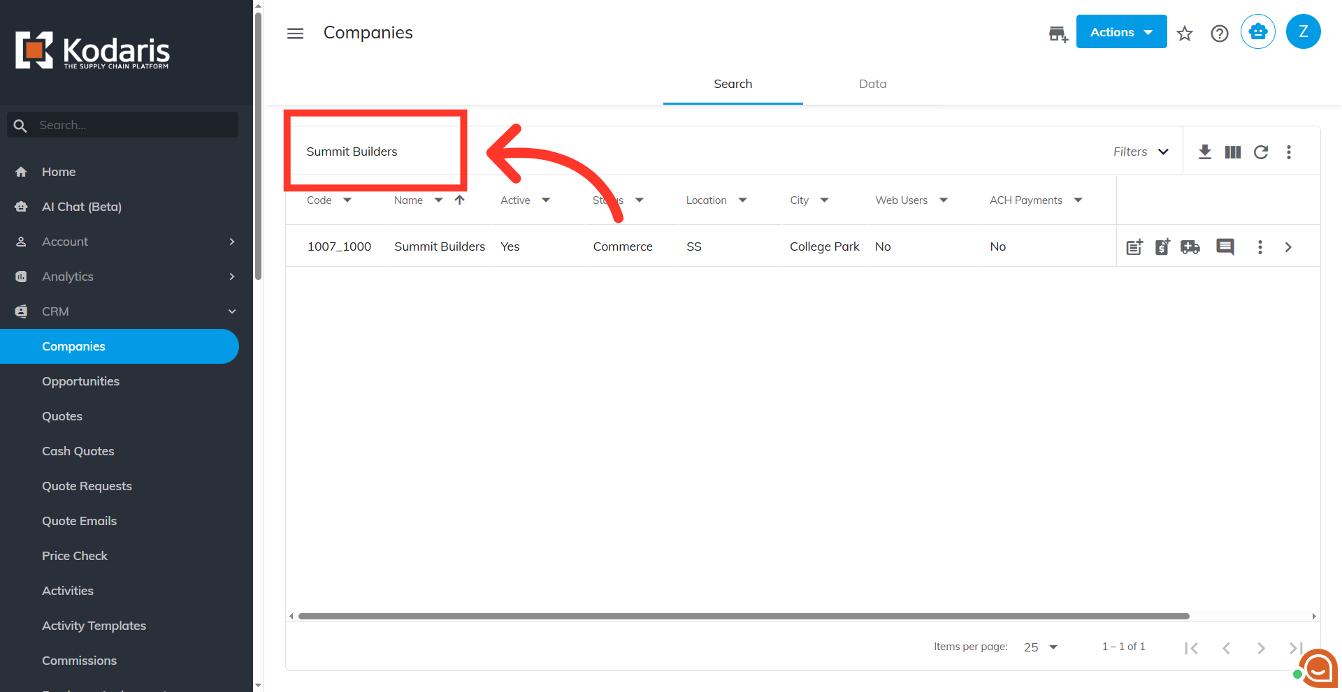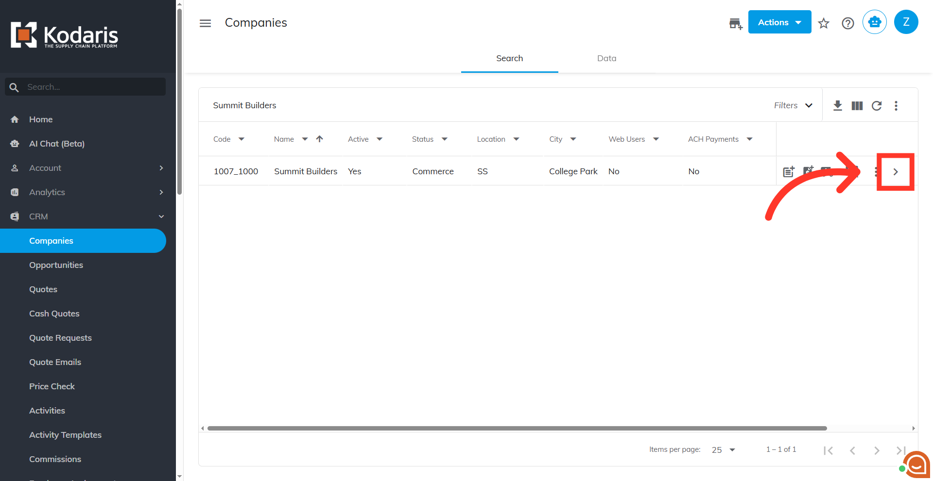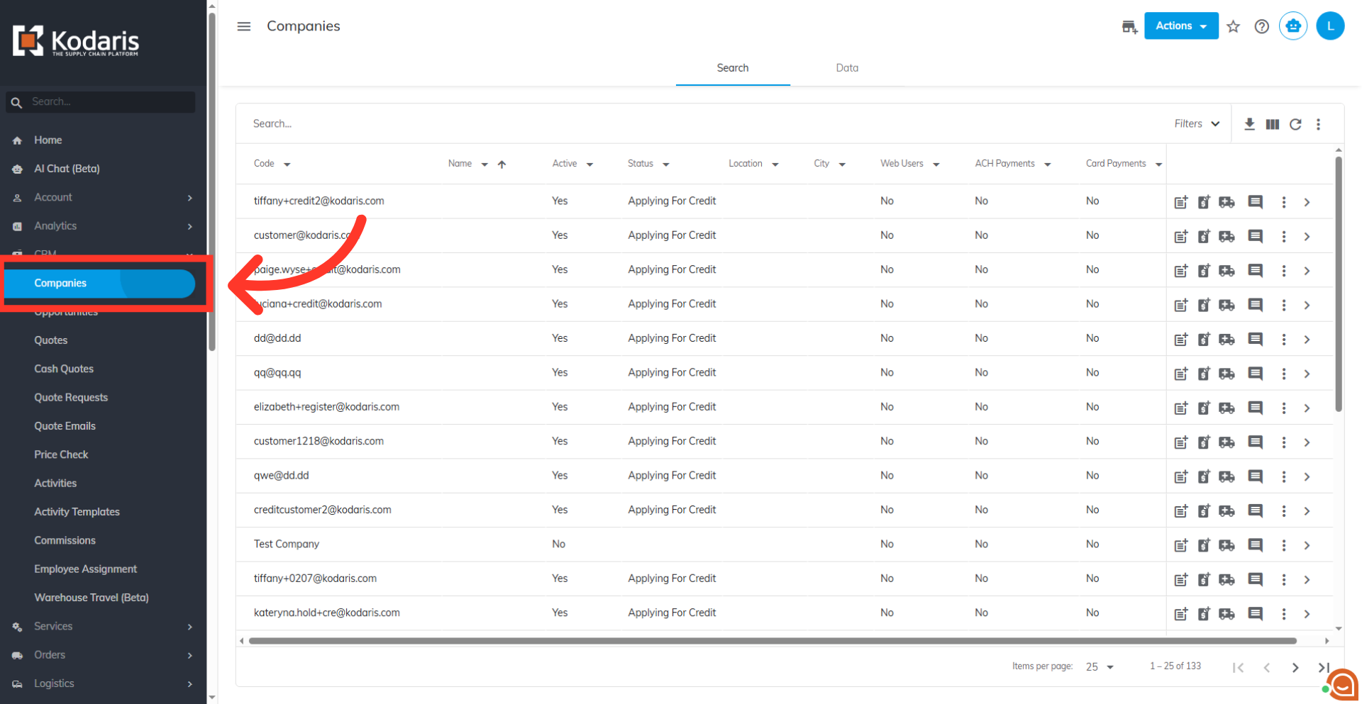 Then, click on "Companies." You can also access "Companies" in the CRM. In order to access "Companies" you will need to be set up either as an "administrator" or a "superuser", or have the appropriate roles: "companyView," "crmCompanyView," "companyEdit," "crmCompanyEdit," and "dispatch".