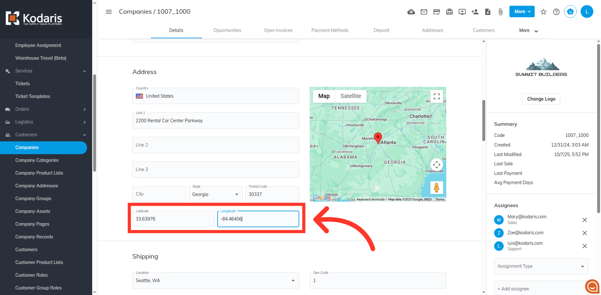 Under the "Address" section, look for the "Latitude" and "Longitude" fields. Manually enter the Latitude and Longitude coordinates for the company's primary address.