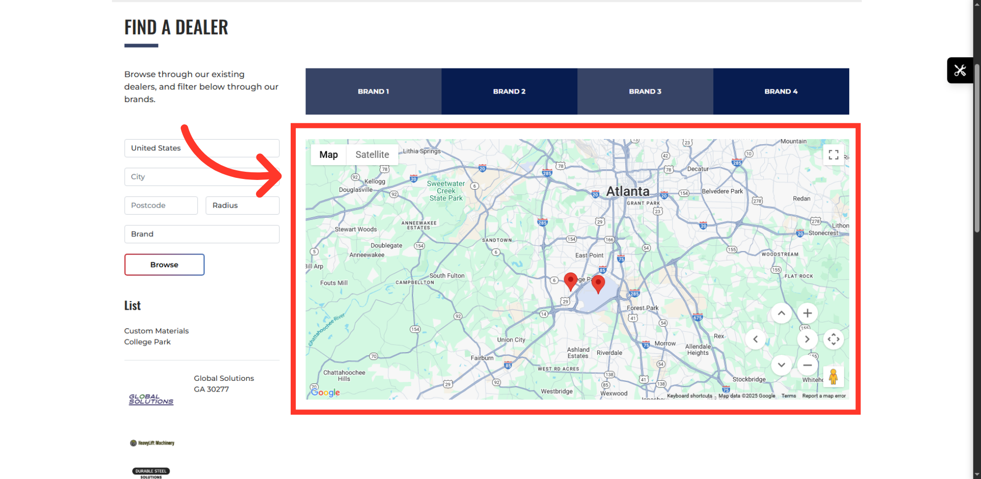 To verify the update, go to your "Find a Dealer" page and verify that the map successfully displays the pin corresponding to the address for the company you just updated.