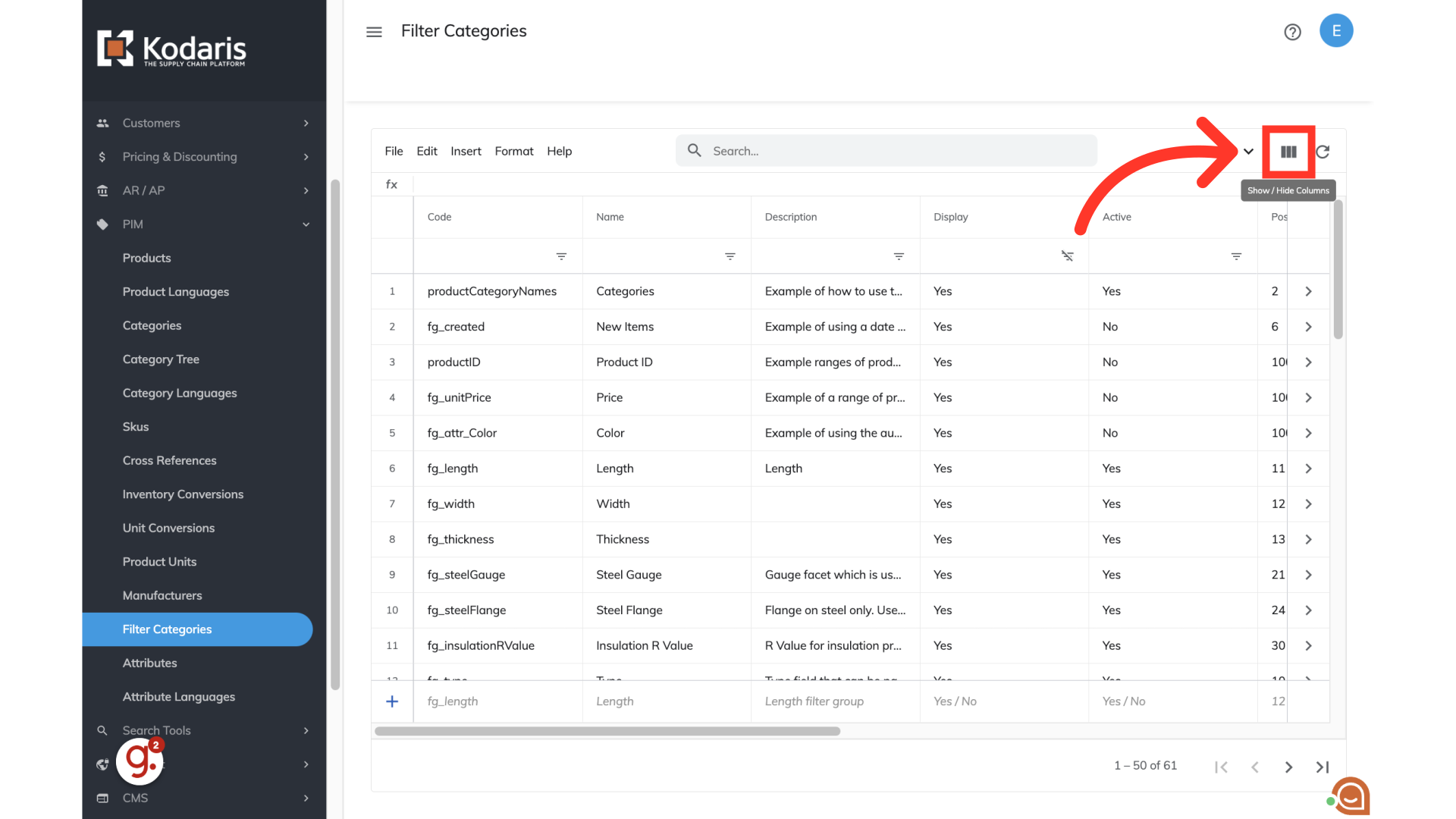 If you would like to export filter category data, you will need to choose the columns of data you would like to export by clicking the "Show/Hide" icon.