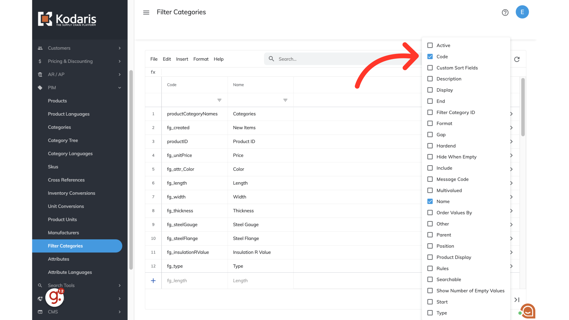A column required for deleting filter categories in the operations portal is the "code" column - the code is required as it is the identifying factor for matching information in the system. The name column can also be helpful when working with filter category data, but is not needed for this import. Select or deselect the columns that you would like to add or remove.