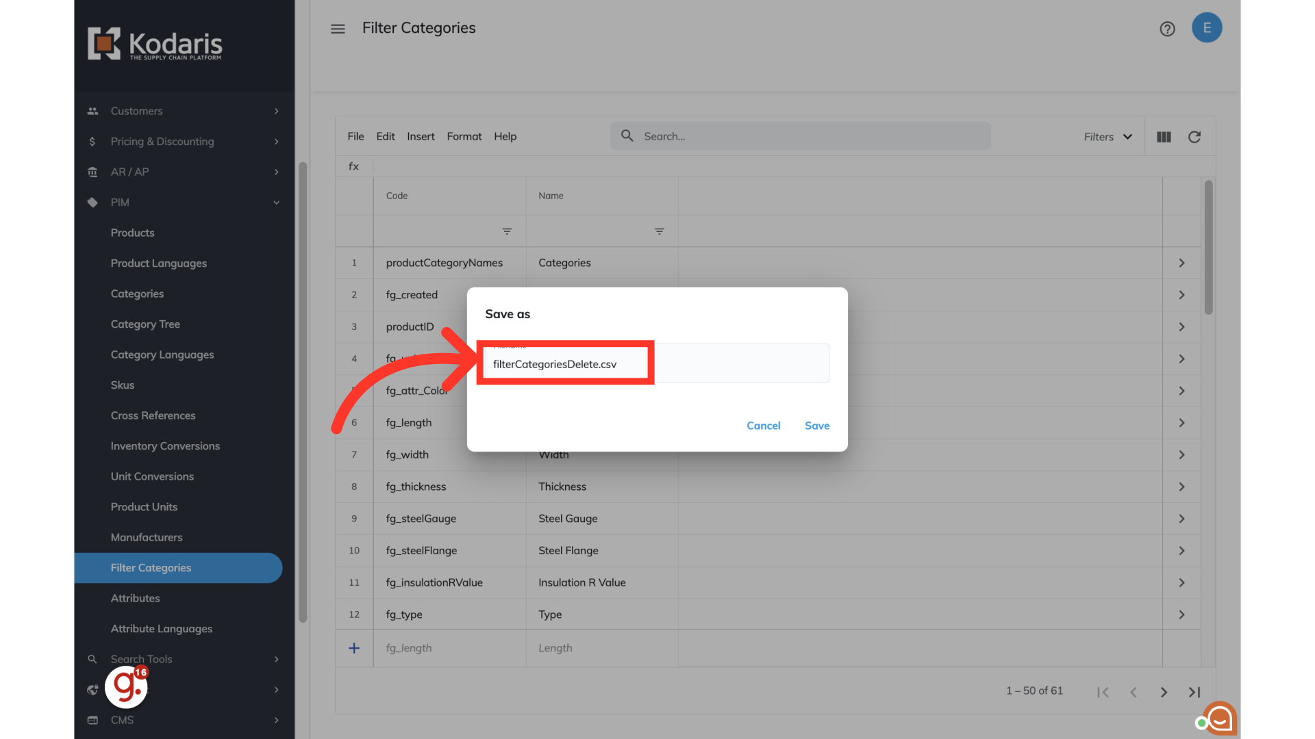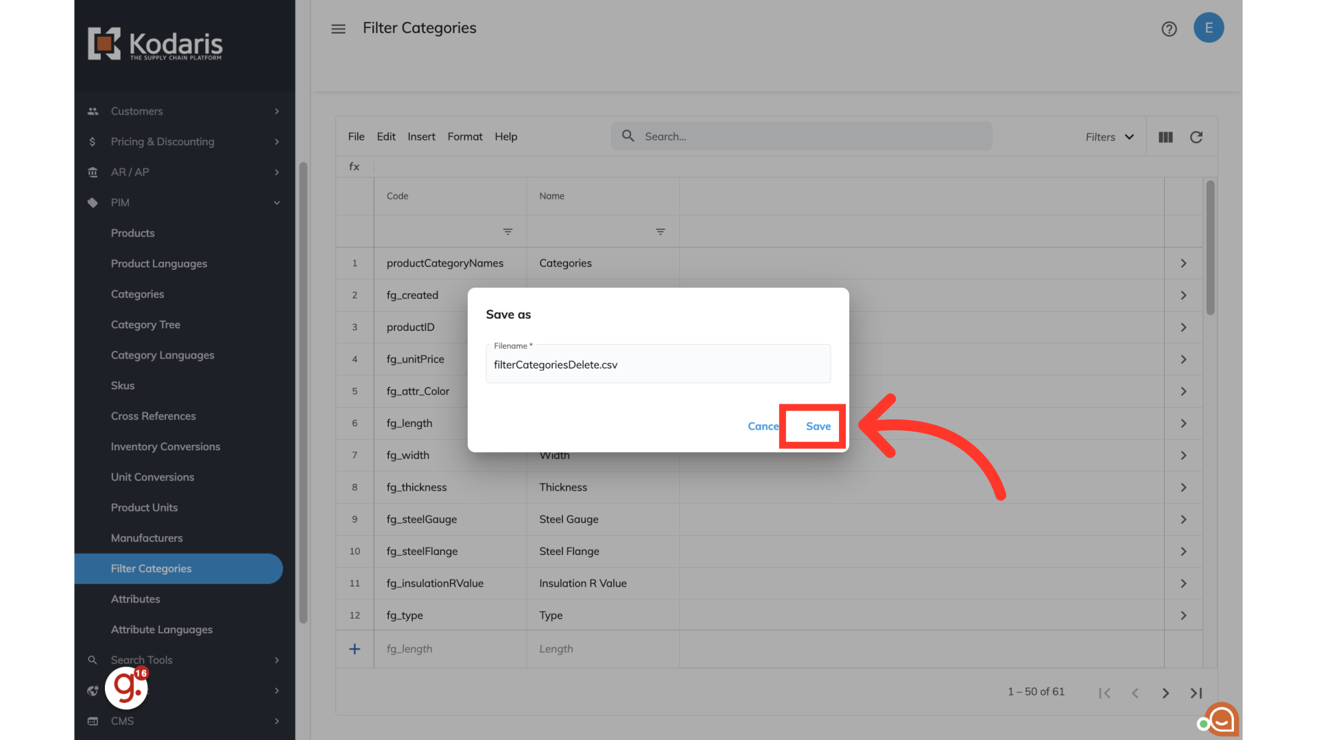 The "sourceModifiedTime" column is also required for mass deleting filter categories. The value should follow the format indicated below and be close to the current time. The time does not need to be exact: “YYYY-MM-dd hh:mm:ss:SSS. An example of the correct format is 2024-09-10 11:45:00:311. Once you have your export or spreadsheet ready for import, be sure to save as .CSV file which is spreadsheet compatible. Double check that the spreadsheet you are importing only contains the filter category codes that you would like to delete from the system. Remove any filter category rows from the spreadsheet that you do not want to delete from the system.