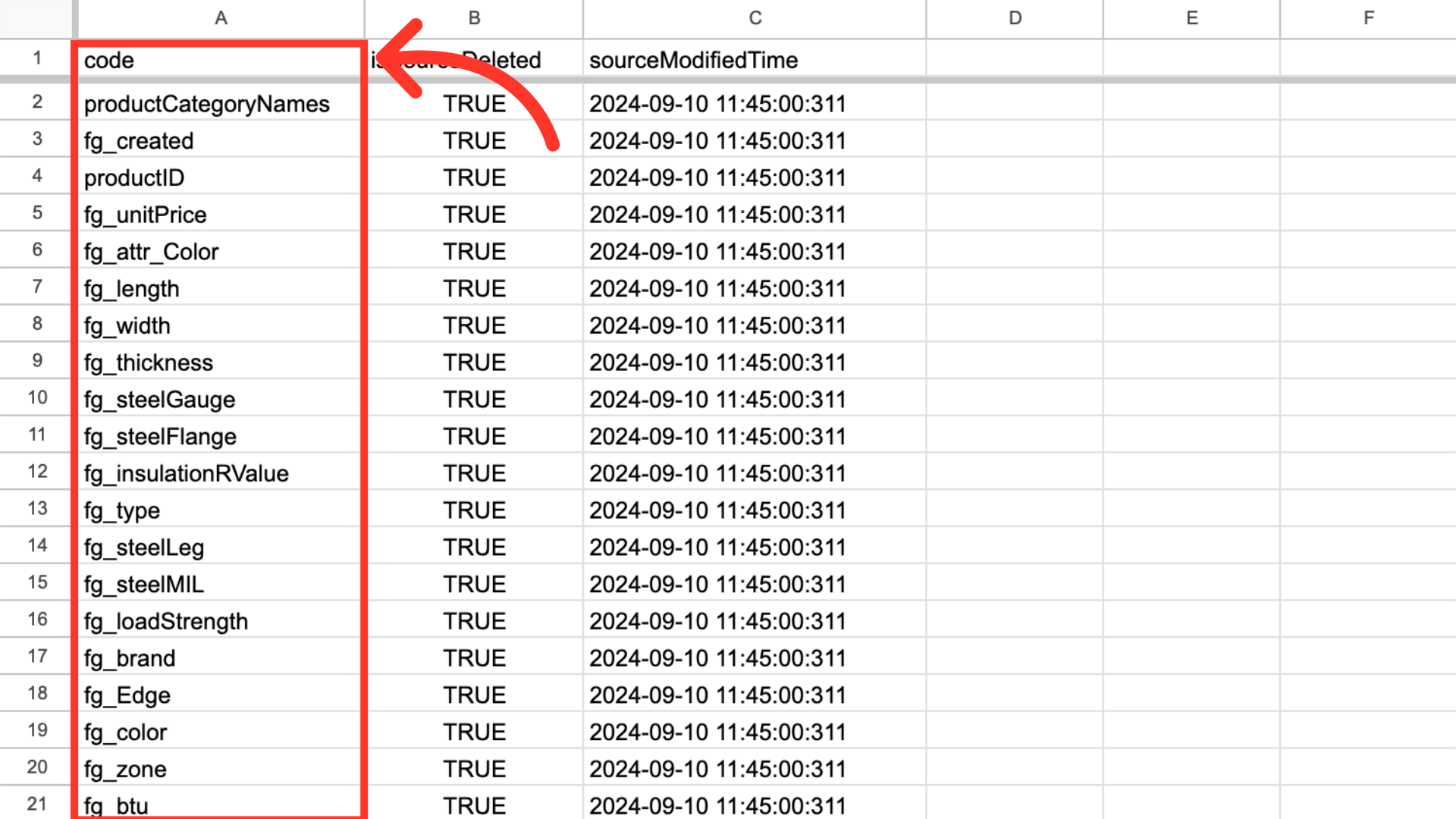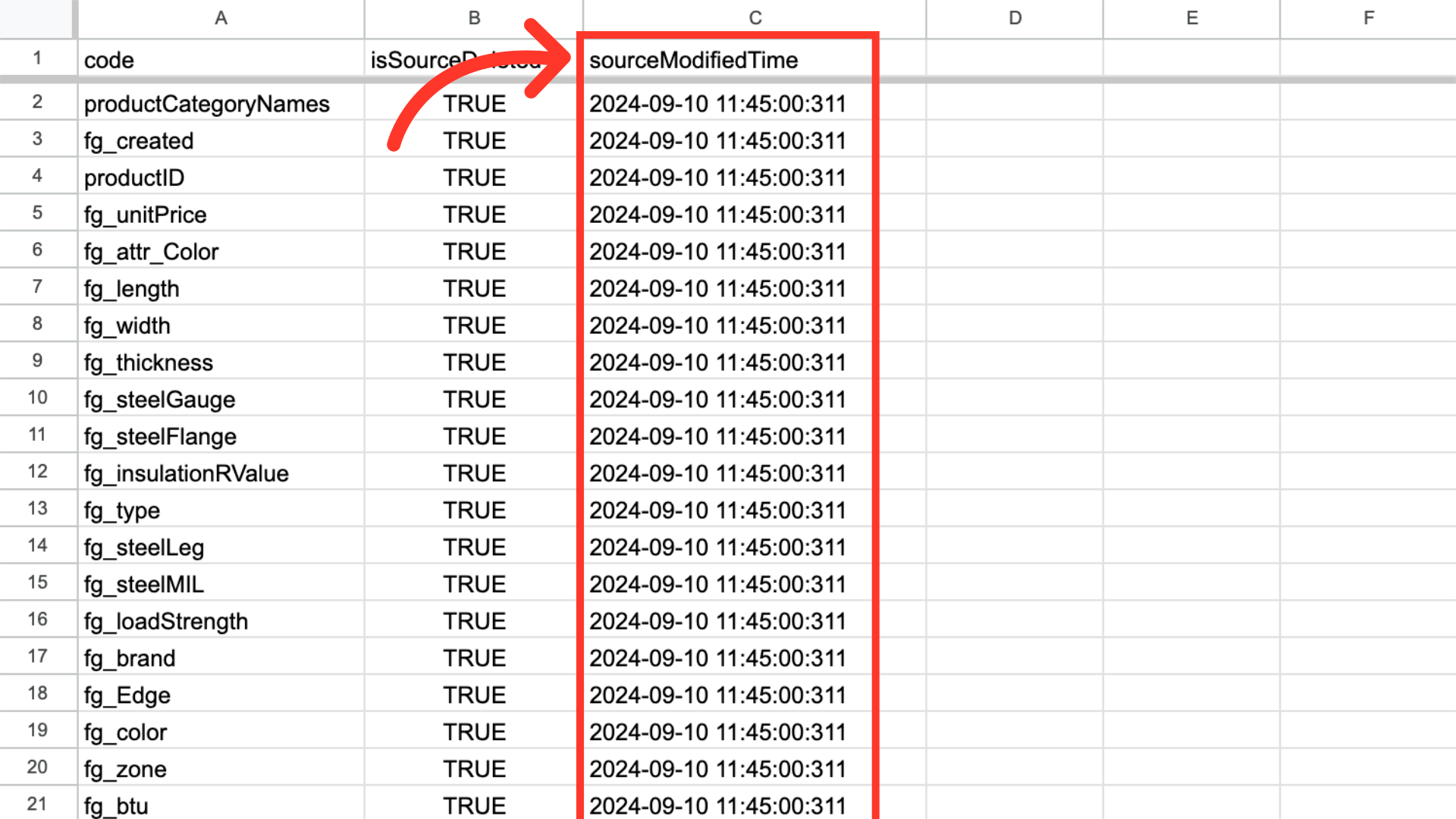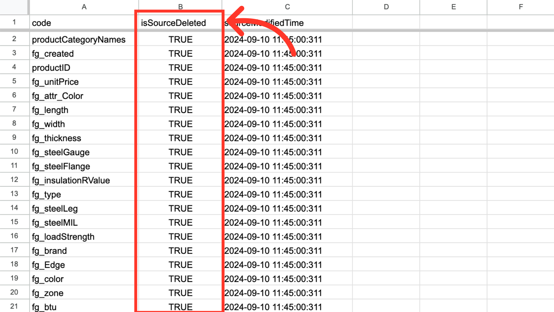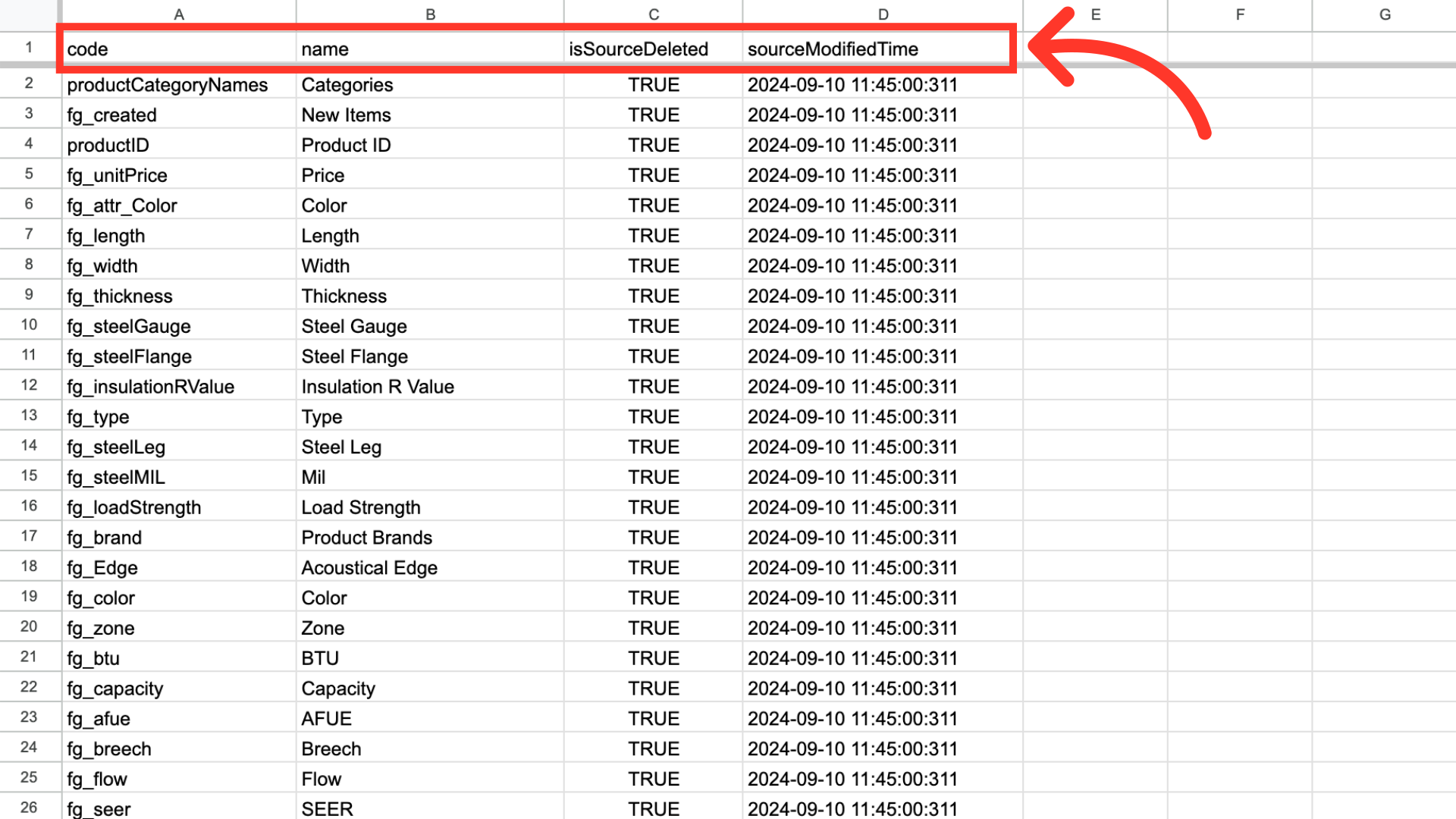 You can see in this sample export that we have added two required columns to the exported spreadsheet, and it now has the header row that is needed. If you are using your own spreadsheet, you will need to make sure the columns "isSourceDeleted" and "sourceModifiedTime" have been added. The name column will need to be removed before importing.