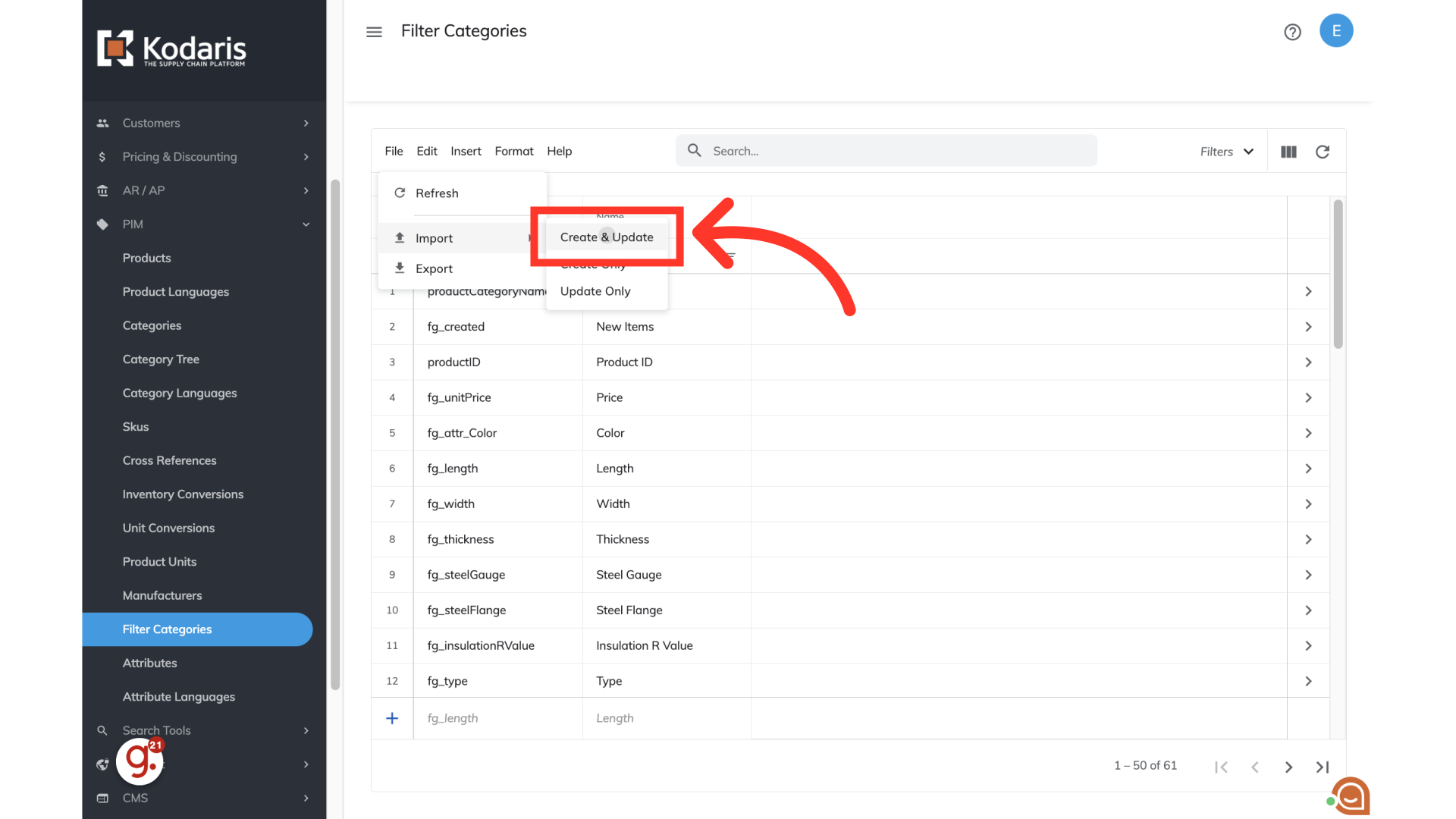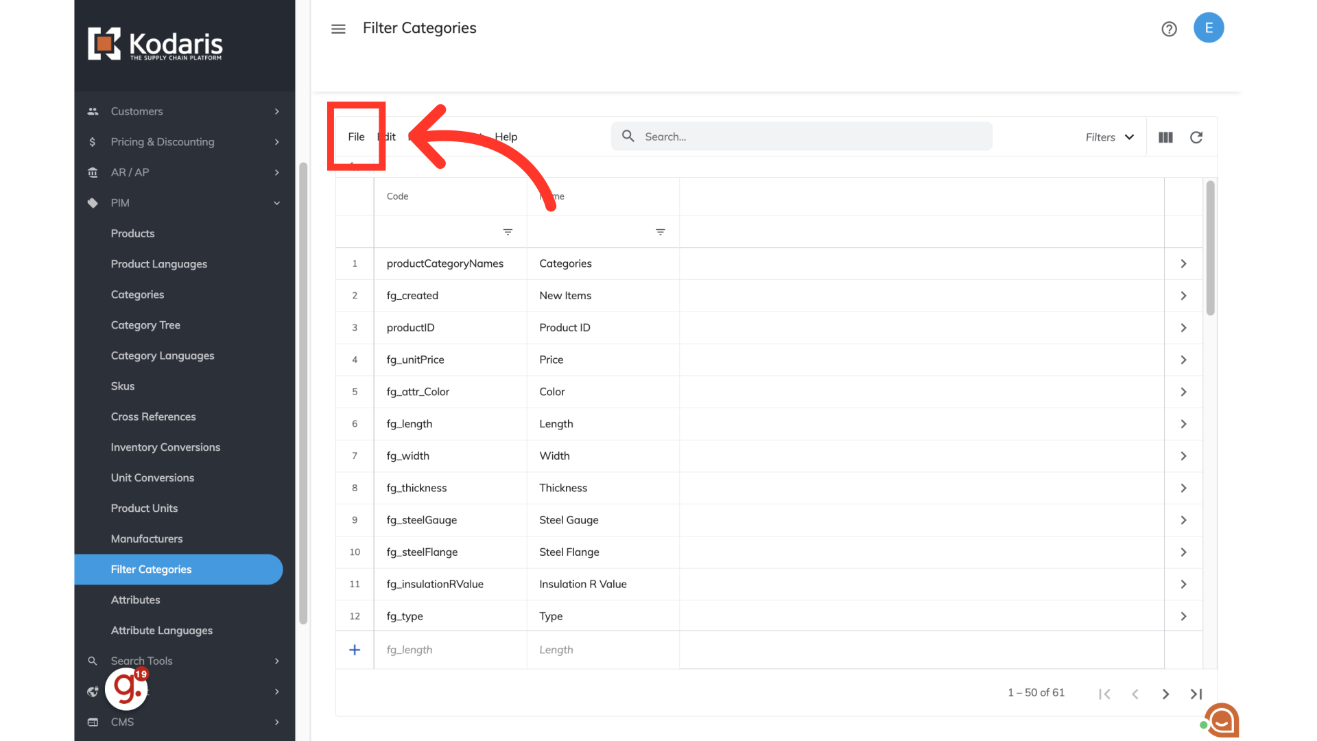 Choose "Export". This export will have all of the filter category codes that are currently in the system.