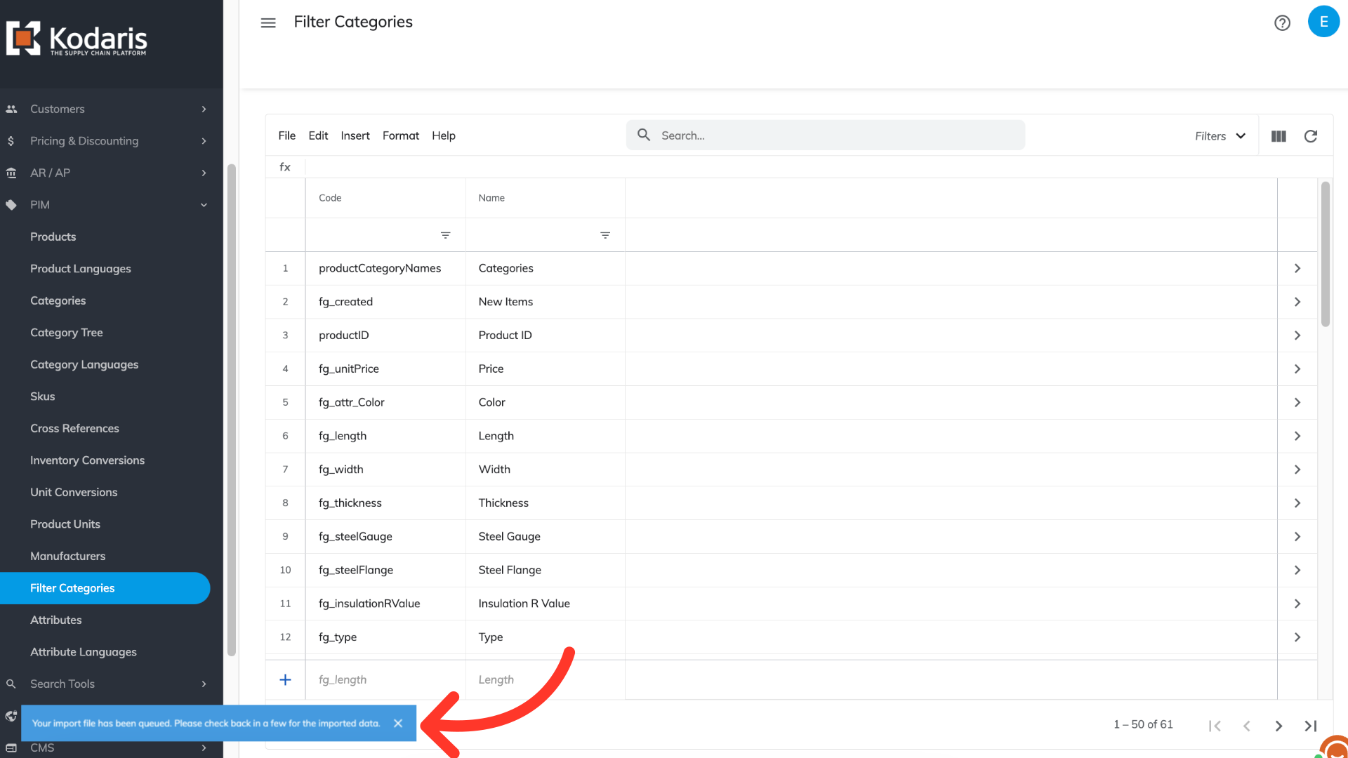 The "code" column contains the filter category codes. When importing filter category data, the code is required as it is the identifying factor for matching information.